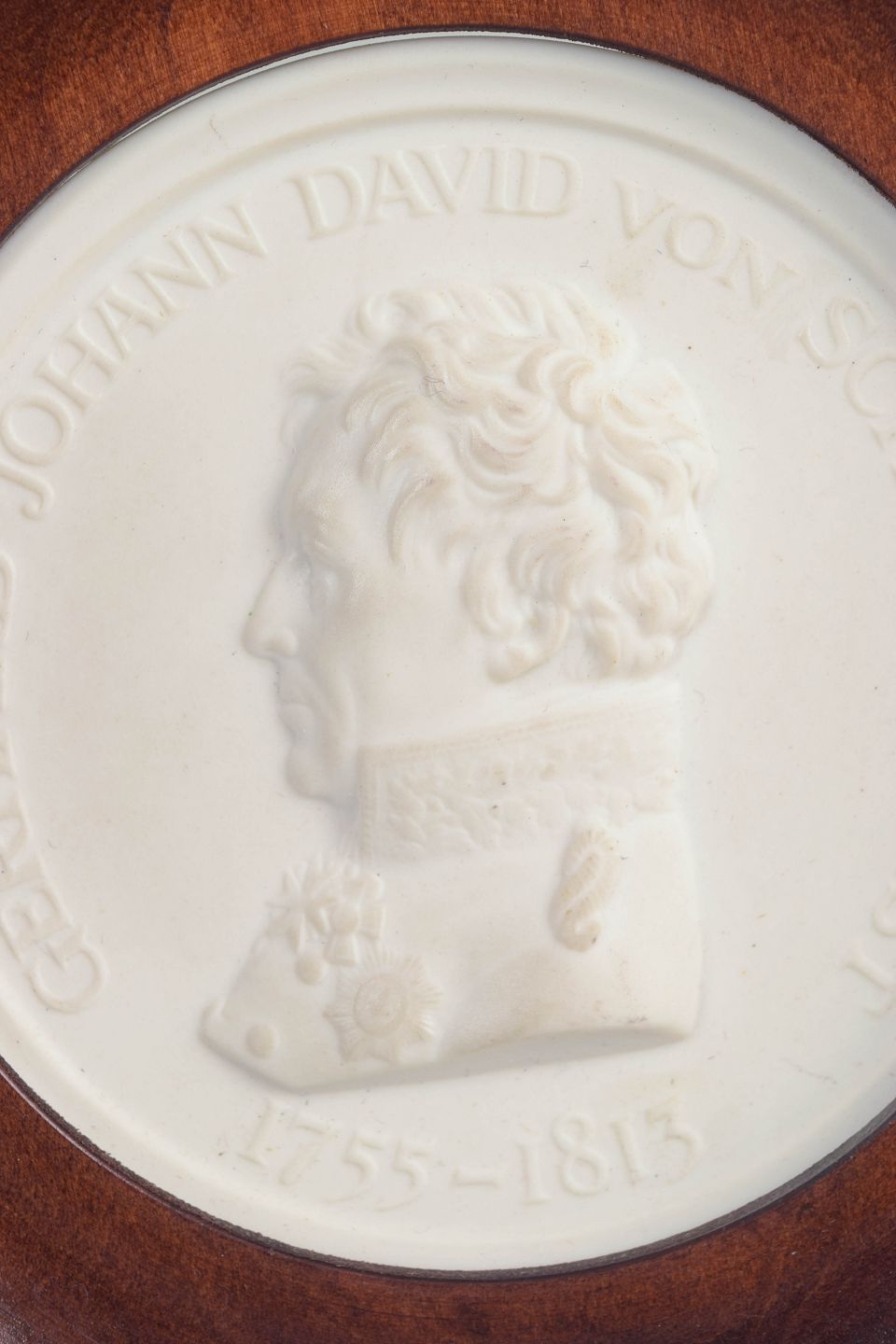 Meissen Biscuit plakette, ca. 1970’erne.Rund reliefplakette i hvid biscuit porcelæn med klassisk profilportræt og cirkulær inskription, monteret i bred, rund træramme. Udført som en medalje lignende, neoklassisk komposition, hvor den matte biscuit overflade fremhæver portrættets fine modellering og historiske karakter.