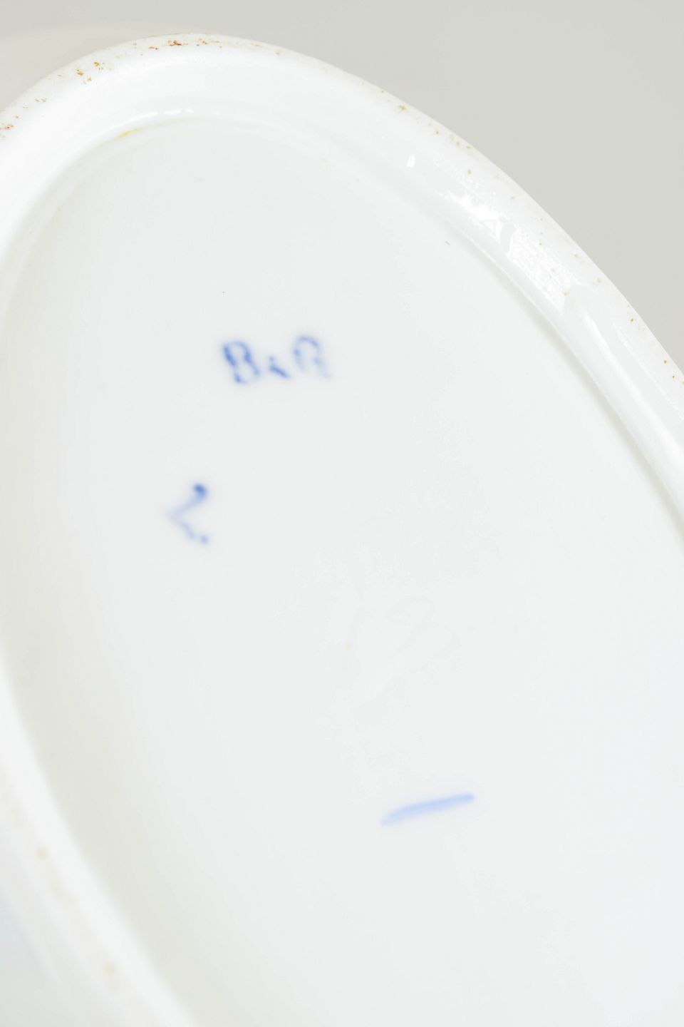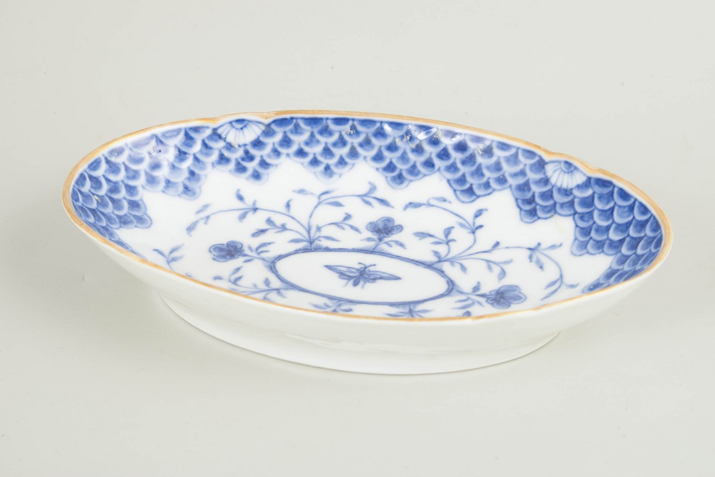 Bing & Grøndahl Sommerfugl fad med guldkant, 1880’erne.Antikt ovalt porcelænsfad dekoreret med blå underglasur i det klassiske Sommerfugl-mønster. Dekorationen er opbygget omkring en central medaljon med sommerfugl og florale ranker, omgivet af en karakteristisk skællet rand og afsluttet med håndpålagt guldkant.