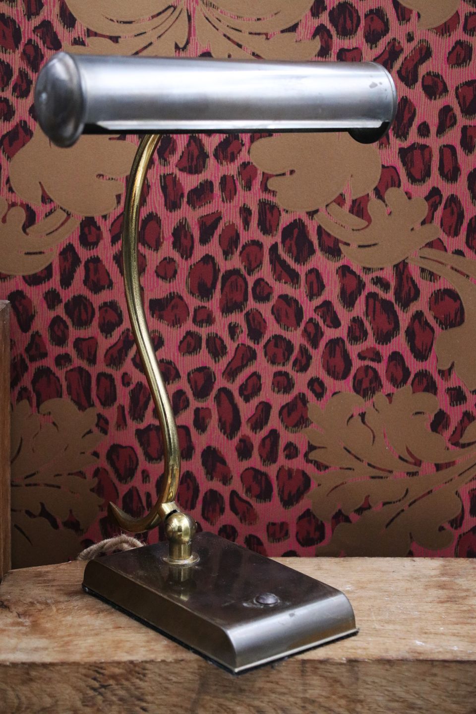 Gammel skrivebordslampe i patineret messing.H: 31cm. Skærm Dia.: L: 20,5cm. Dia.: 4,5cm.