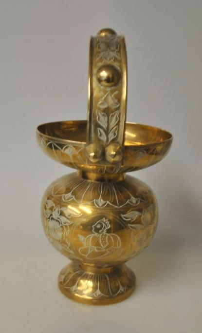 Indische Messingvase mit Henkel, um 1950. Mit gravierten Verzierungen eines sitzenden Prinzen und Blumen. Höhe: 21 cm.Bestellnummer: 28720