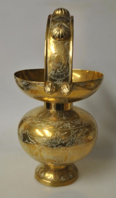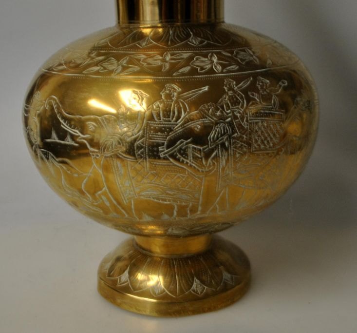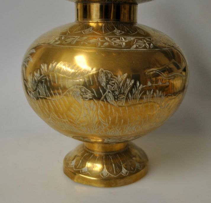 Große indische Messingvase mit Henkel, ca. 1950. Mit gravierten Darstellungen einer Elefantenjagd auf einen Tiger. An der Seite sind vier Tiger abgebildet. Außerdem sind florale Motive eingraviert. 32 cm hoch, 21 cm breit.Bestellnummer: 28721