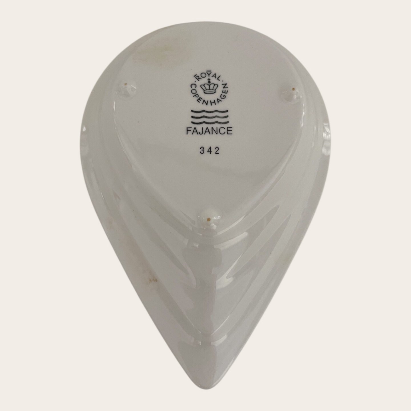 Royal Copenhagen, Aluminia, Tropfschale / Deckel für Krug (Artikel-Nr. 629133), Weiß Nr. 342, 1. Sortierung, 13 cm lang, 8,5 cm breit, Design Ursula Munch Petersen *Guter Zustand mit leichten Gebrauchsspuren*Lager: 1