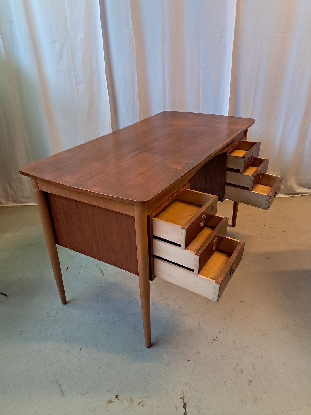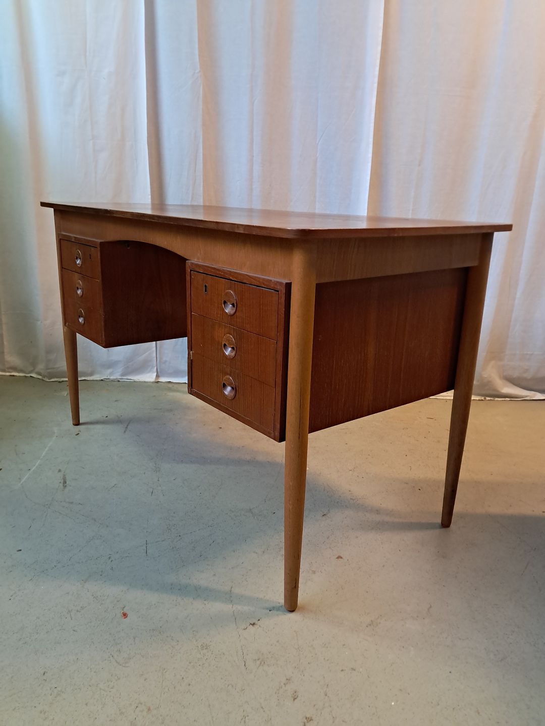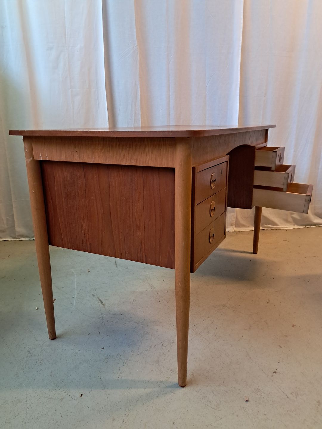 Skrivebord i fineret teaktræ, fra 1960erne.Det har brugsspor.