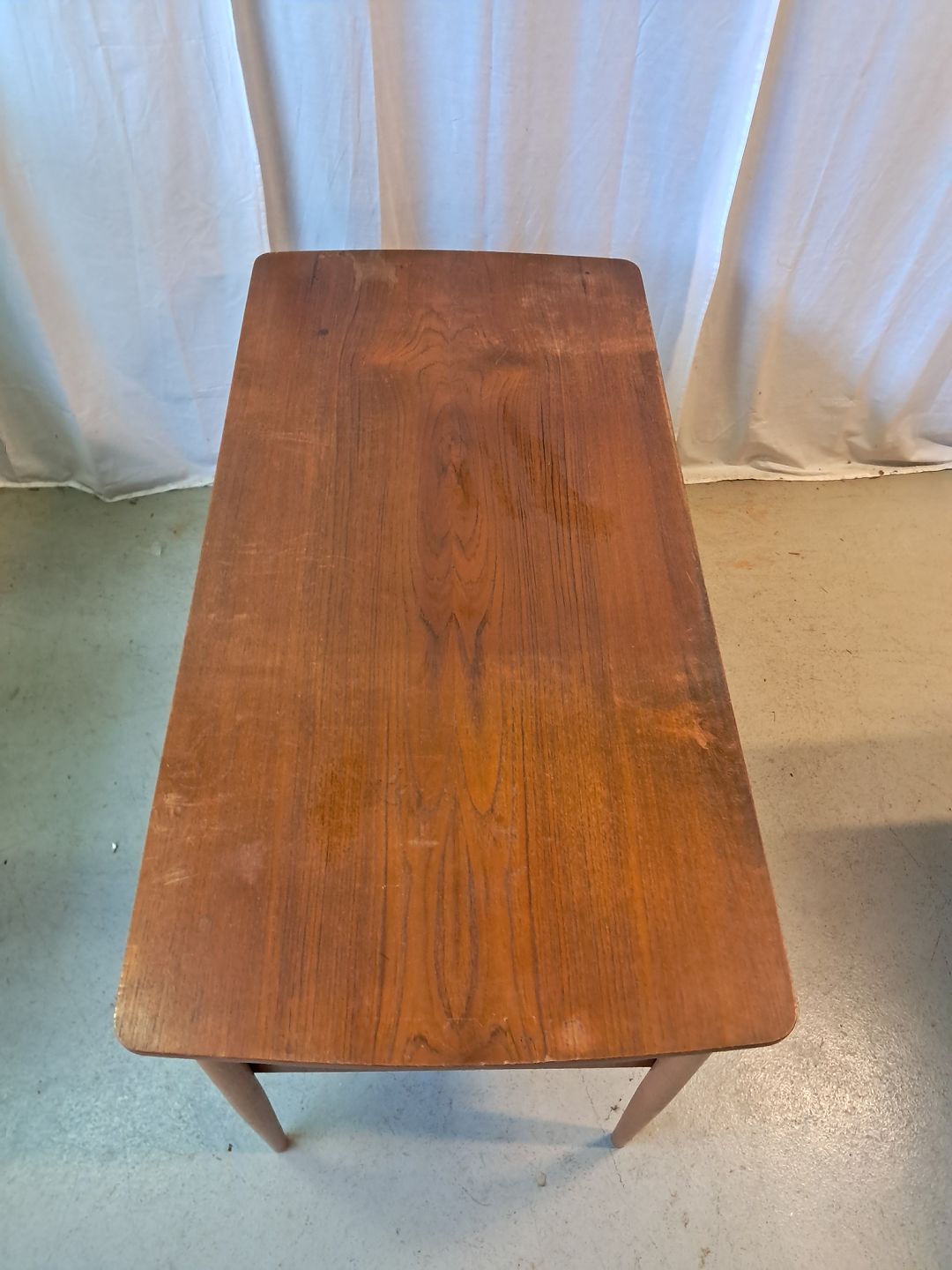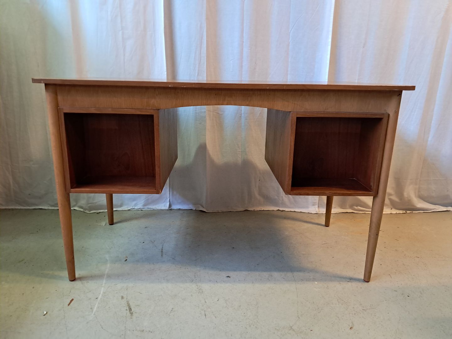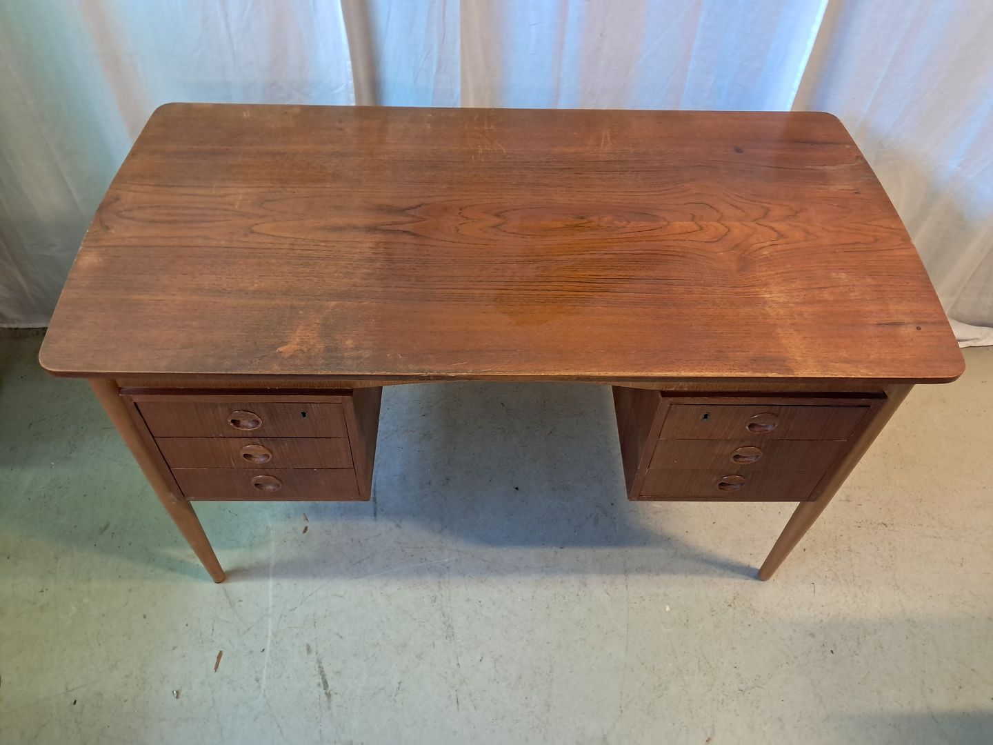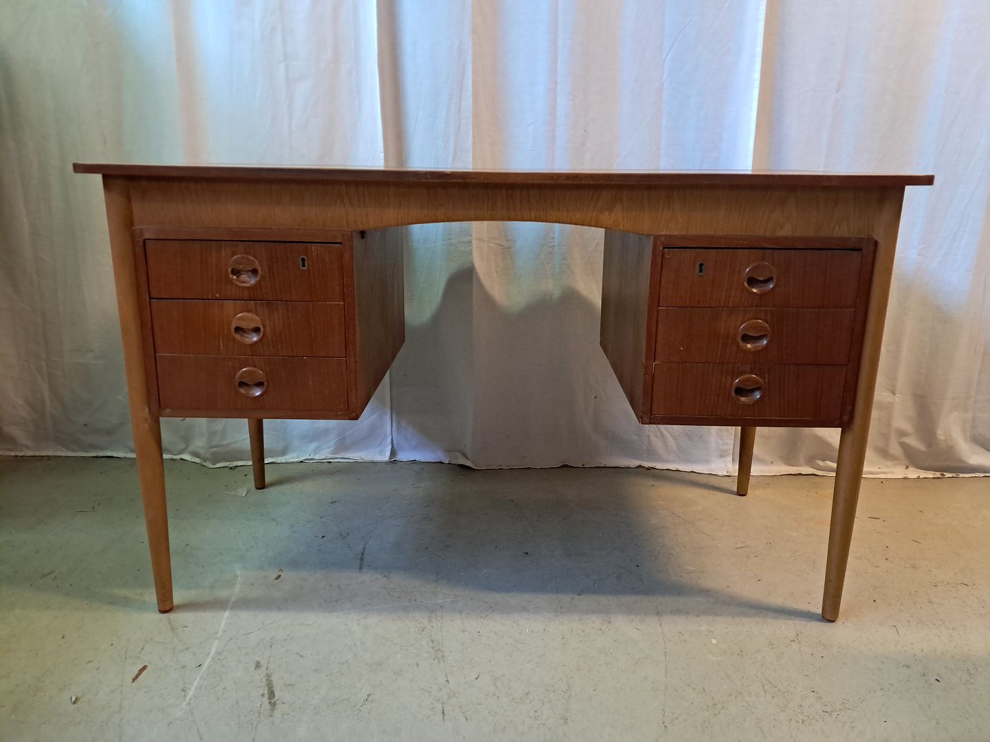 Skrivebord i fineret teaktræ, fra 1960erne.Det har brugsspor.