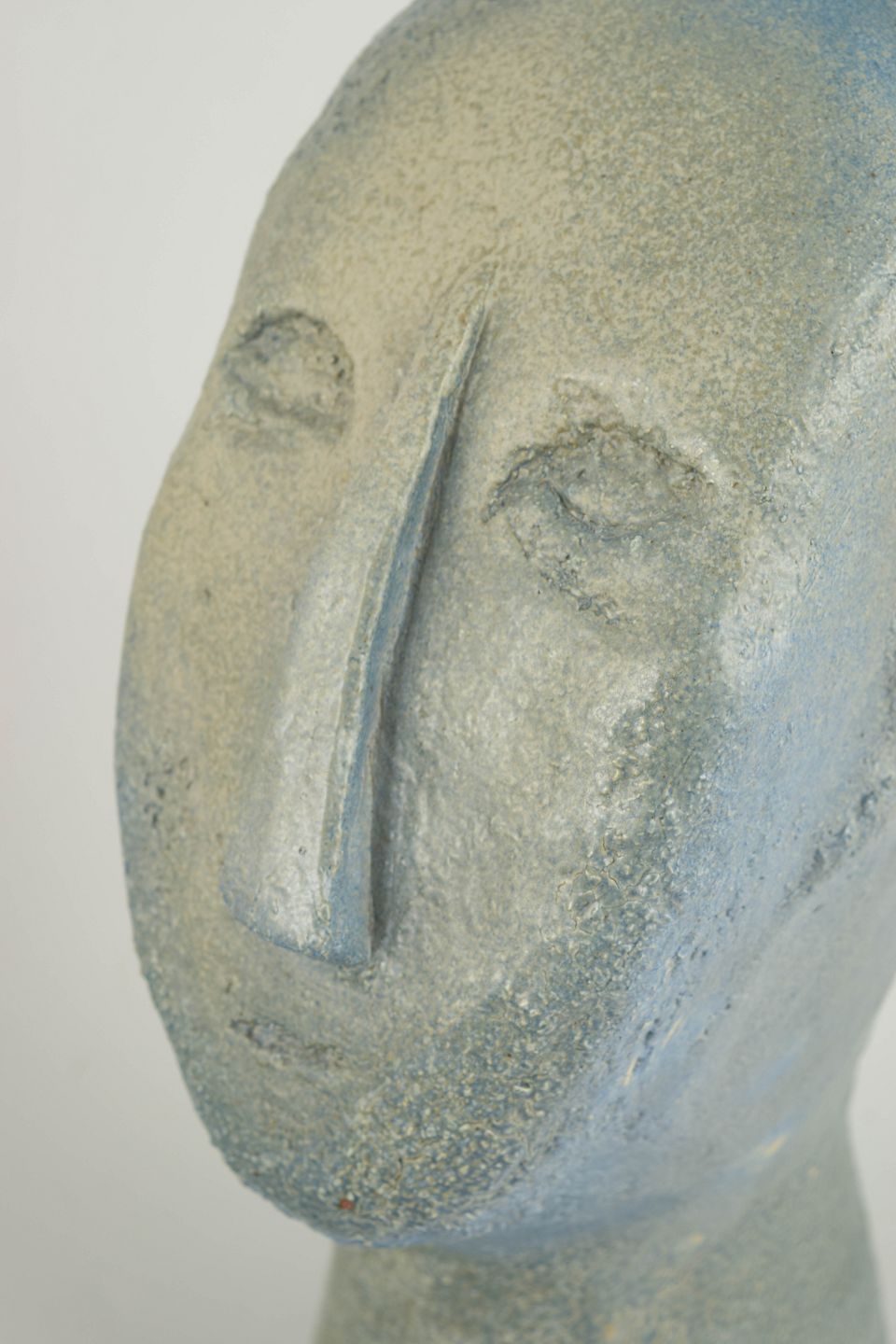 Unik, håndformet skulptur i stentøj med stiliseret hovedform og et roligt, skulpturelt udtryk. Overfladen er præget af en mat, let struktureret glasur i afdæmpede blå og grå nuancer. Signeret “M.H.”. Fremstår som et selvstændigt kunstnerisk værk inden for europæisk studiokeramik.