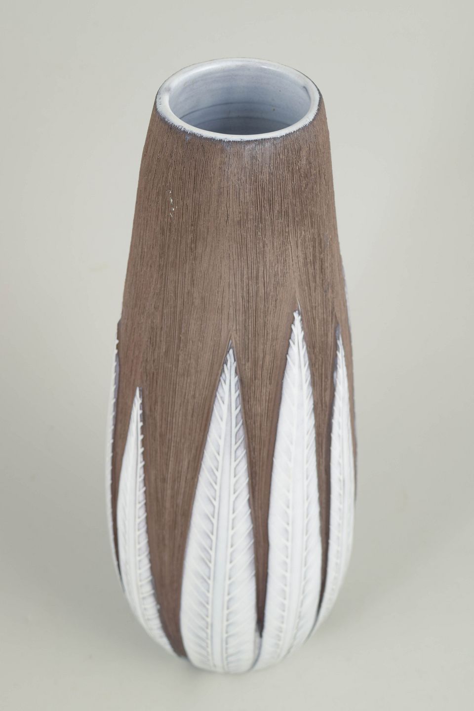 Anna-Lisa Thomson for Upsala Ekeby, Paprika vase.Elegant vase i stentøj med karakteristisk reliefdekoration inspireret af paprikaformede blade, udført i kontrasterende glasurer i jordfarvede og lyse toner. Et ikonisk design med klar tilknytning til svensk midten-af-århundredet keramik.
