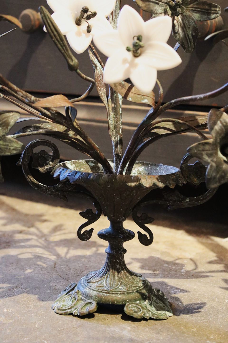 Antik fransk kirkestage i helt mørk patina , dekoreret med 5 gamle hvide opal glas blomster...