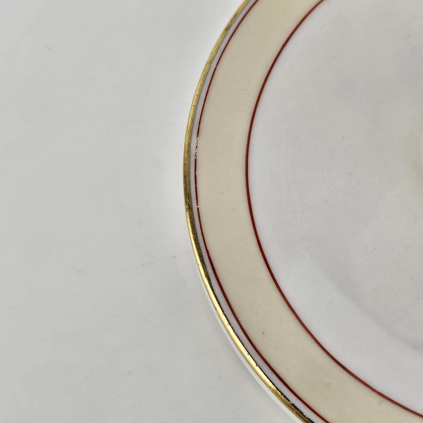 Service i glat hvidt porcelæn pyntet med dekoration i beige, brændt orange og gylden streg.