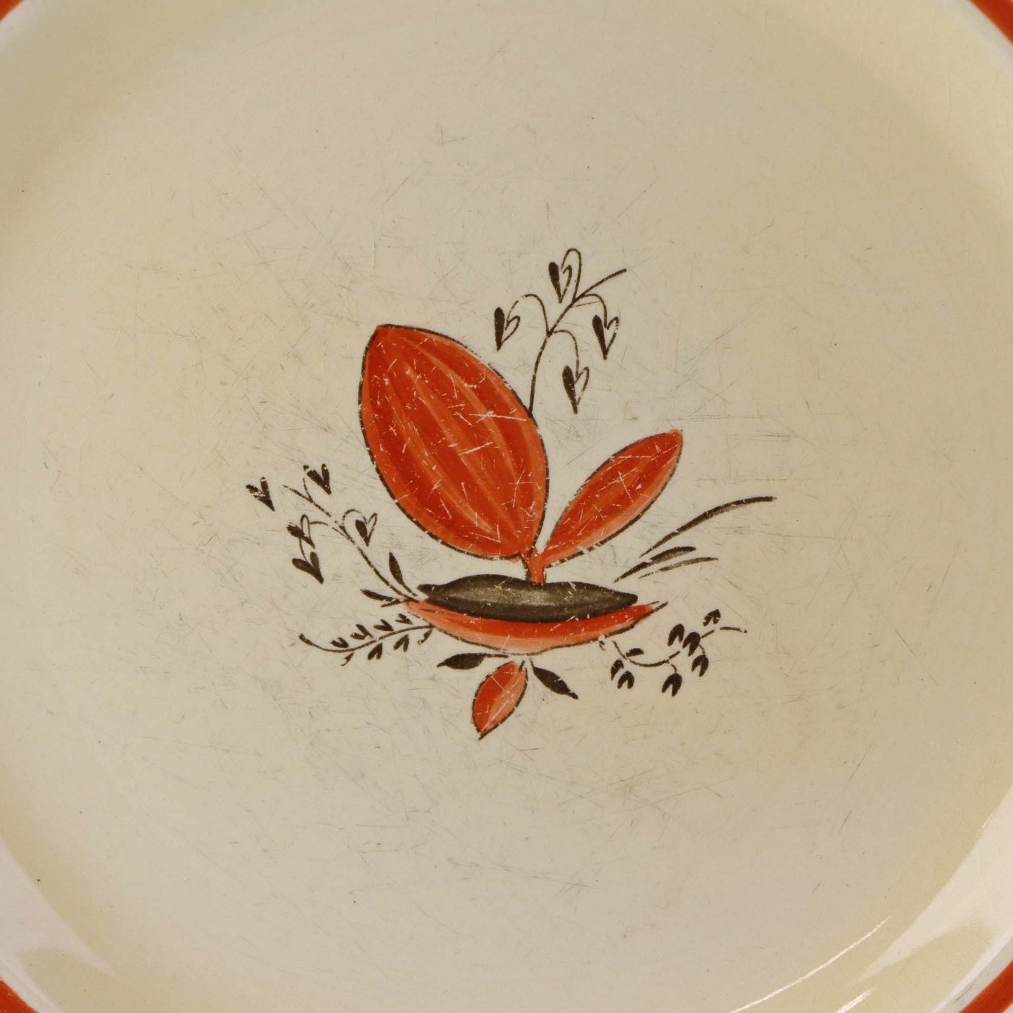 Fremstår med brugsspor på dekorationen og spor efter brug i bunden af tallerknen.