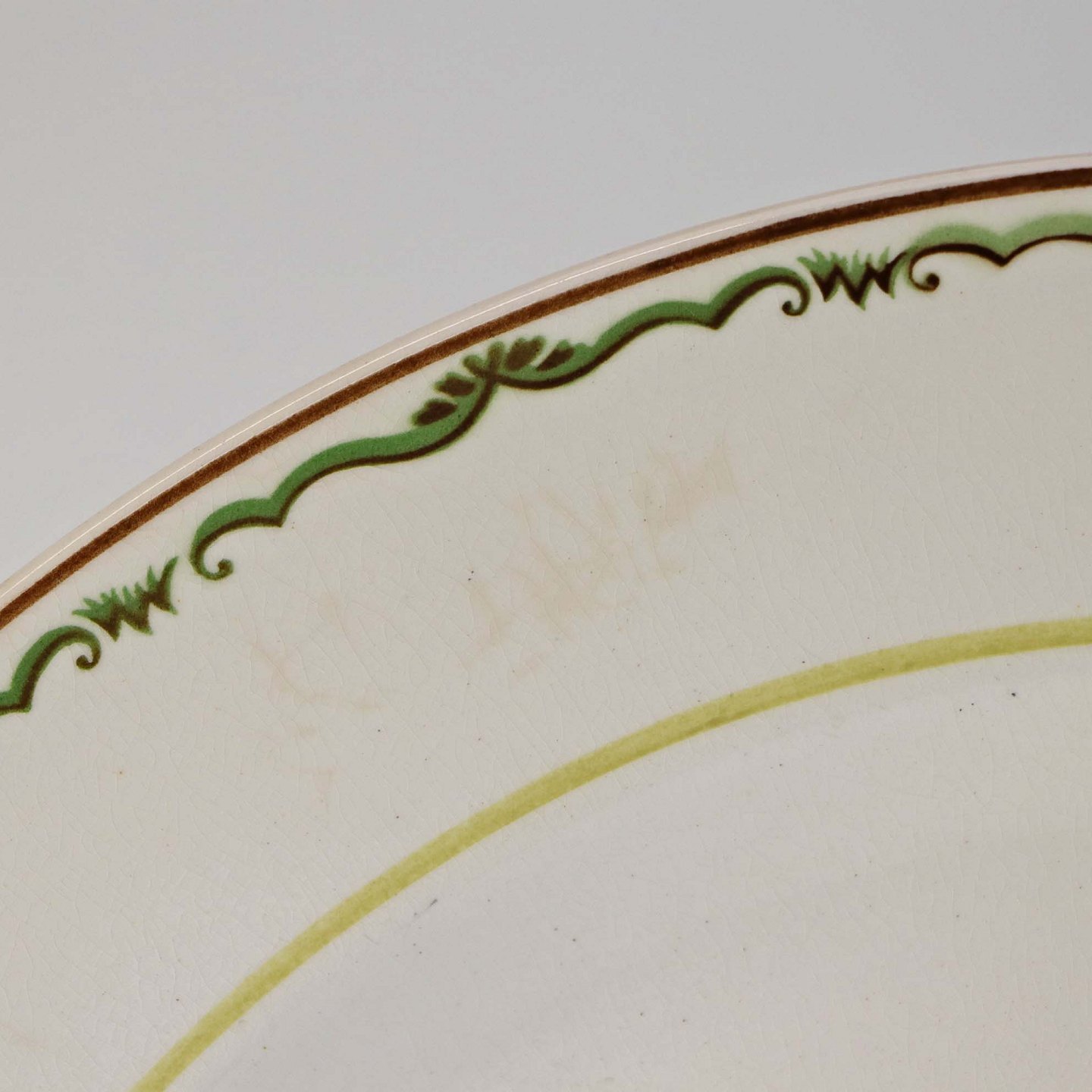 Fremstår med ujævnheder i glasuren på bagsiden, krakkeleringer i glasuren og mindre områder med bruneringer under glasuren.