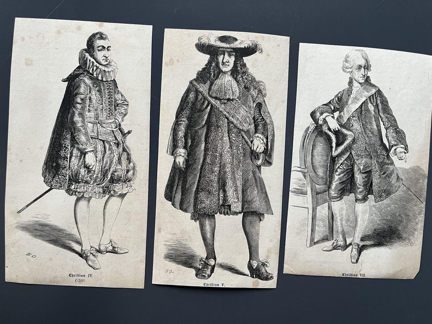 3 Xylografier af Bernhard Olsen - DH Kong Christian IV, V og VII.