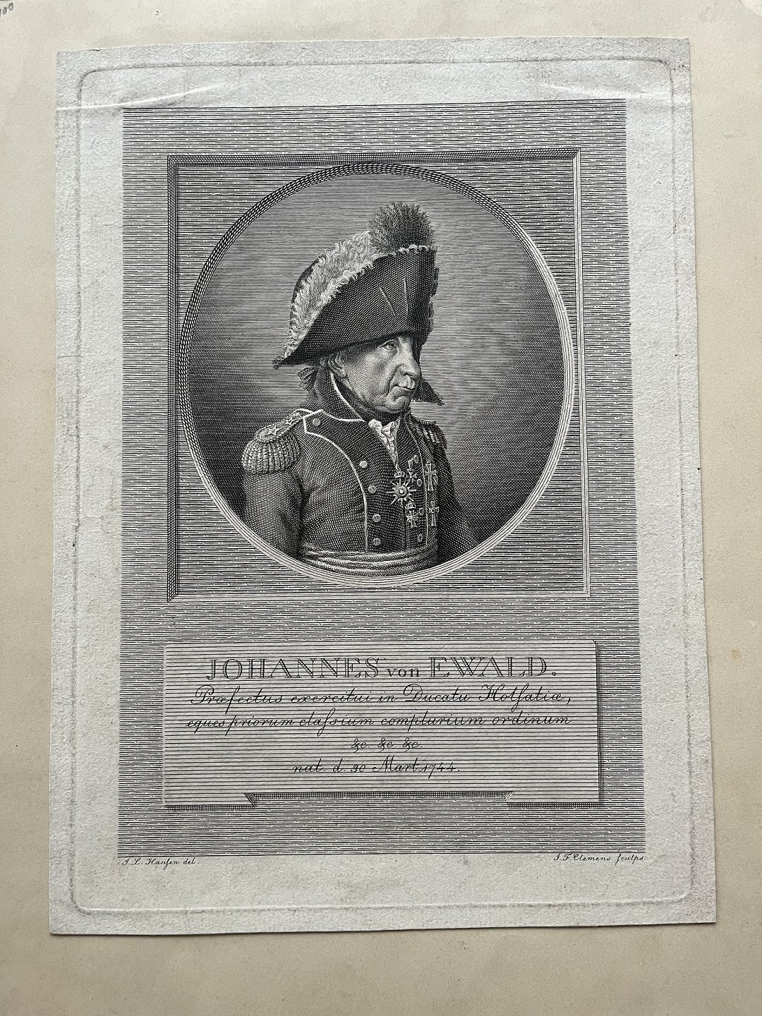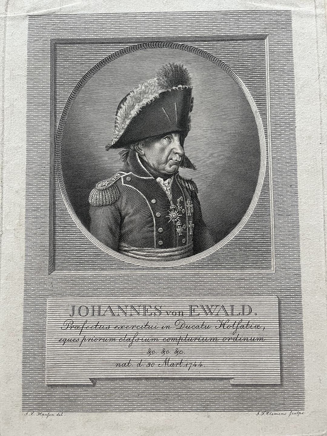 Kobberstik af J.F. Clemens - Portræt af Generalløjtnant Johann von Ewald.