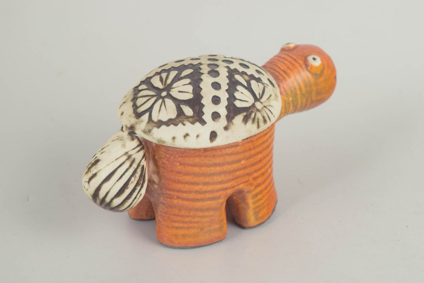Lisa Larson for Gustavsberg, skildpaddefigur.Stiliseret skildpadde i stentøj med kompakt, næsten arkitektonisk kropsform og korte, kraftige ben. Udført med varm, orangebrun glasur på kroppen og kontrasterende skjold dekoreret med grafiske blomster- og prikmotiver i sort og råhvid. Et karakteristisk eksempel på Lisa Larsons figurative formsprog fra 1970’erne, hvor humor og enkelhed kombineres med stærk dekorativ virkning.