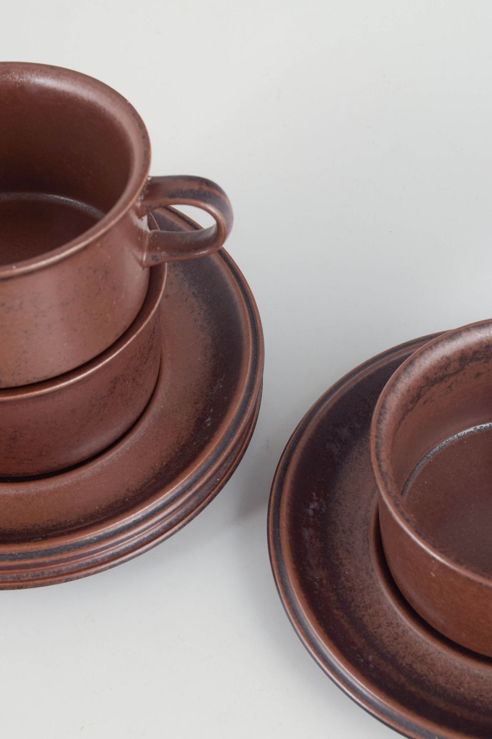Sæt bestående af tre tekopper i stentøj med matchende underkopper fra Ruska-serien hos Arabia. Udført med den karakteristiske, melerede brune glasur i varme jordtoner. Cylindrisk kopform med hank og brede underkopper med let forhøjet fane. Glasuren varierer naturligt og giver hvert sæt et individuelt udtryk.