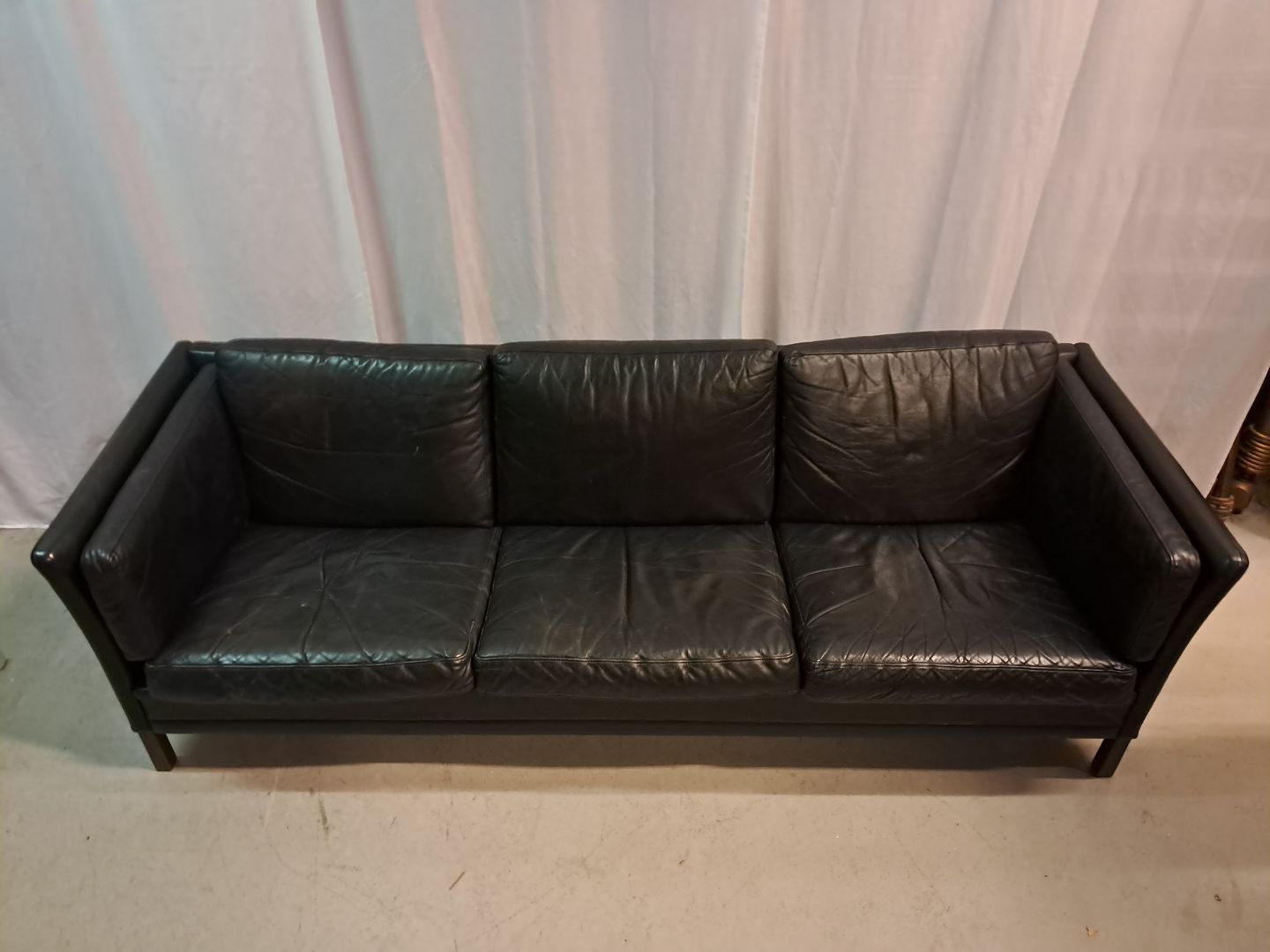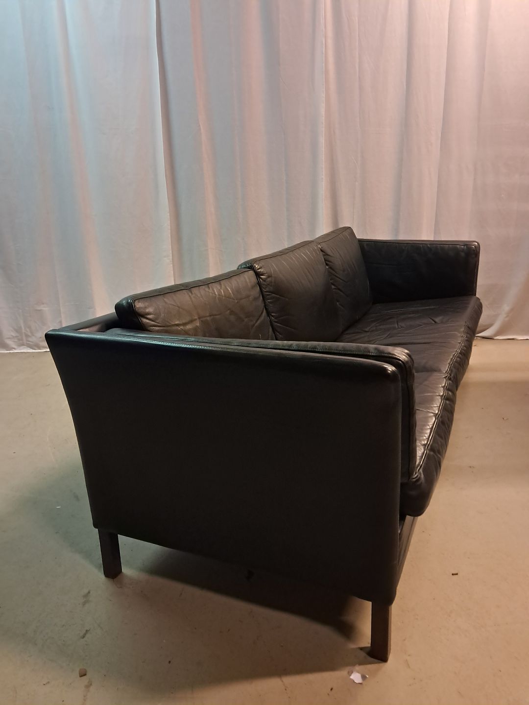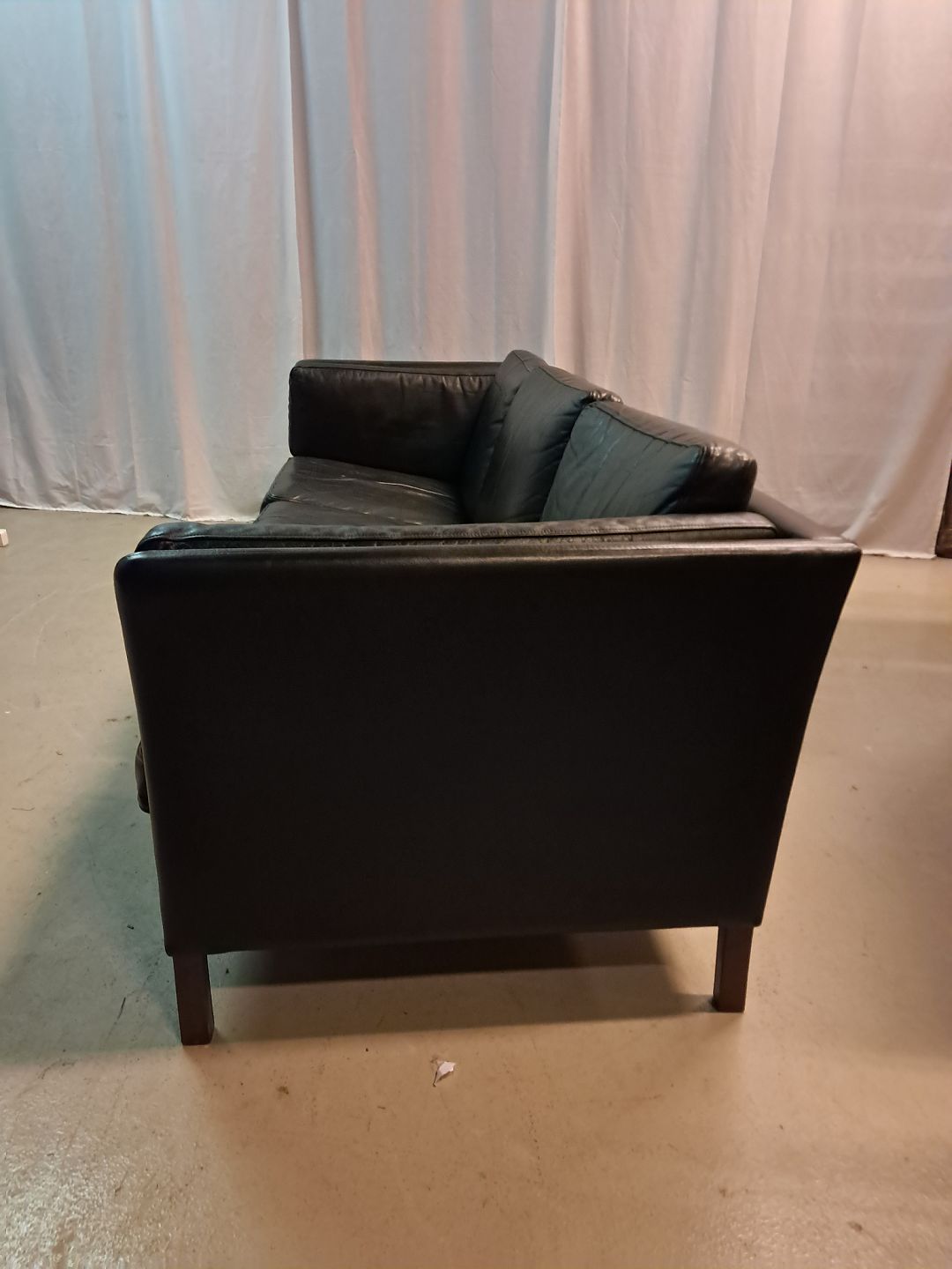 Sort lædersofa fra 1980erne.Den har brugsspor.