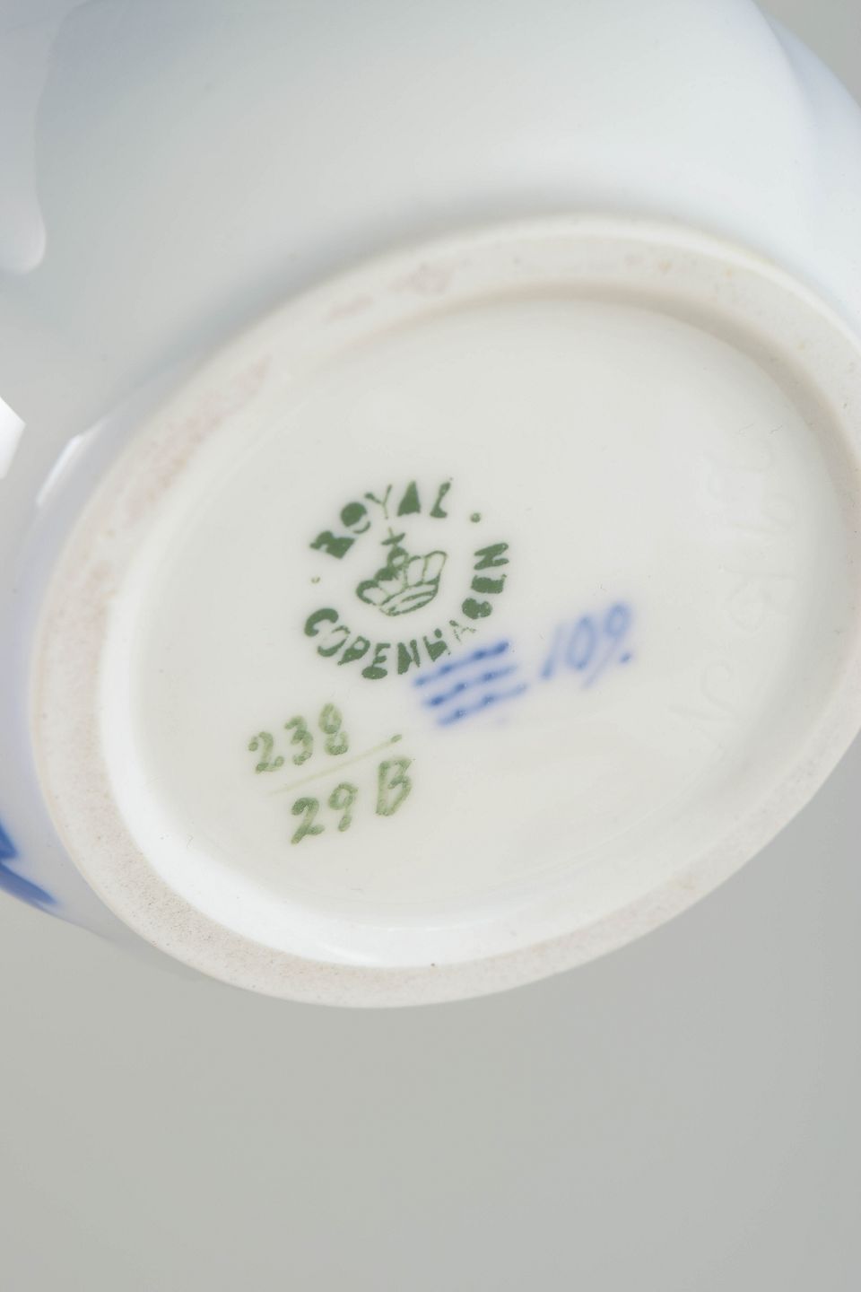 Royal Copenhagen, Art Nouveau vase med hank.Vase i glaseret porcelæn med integreret hank og håndmalet underglasurdekoration i Art Nouveau-stil med stiliseret blomsterform i bløde blå nuancer. Udført efter Royal Copenhagens model 238/29b.