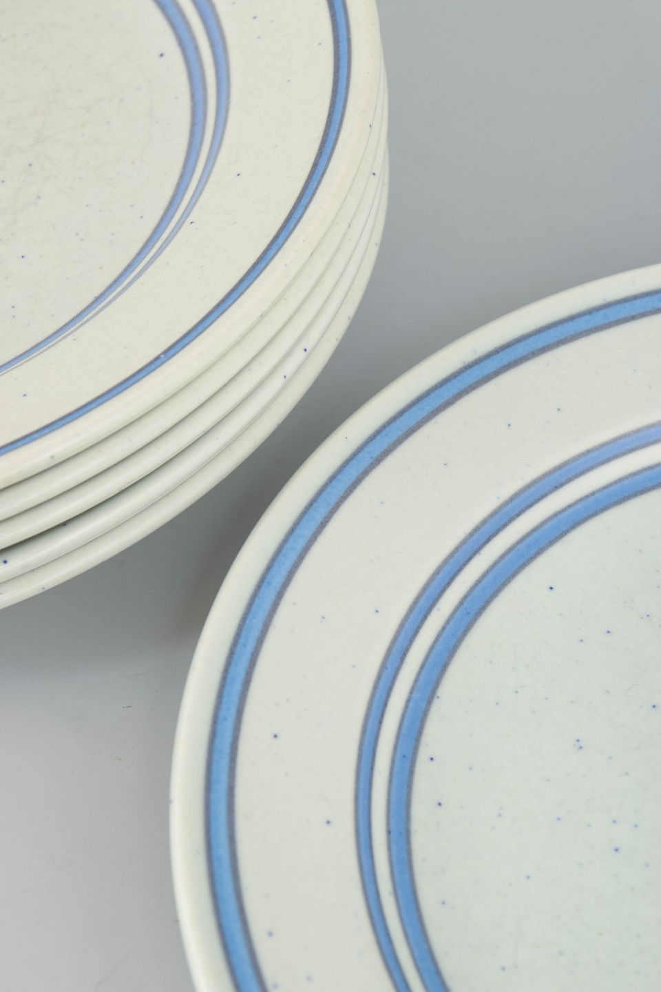 Stig Lindberg for Gustavsberg, seks tallerkener.Sæt af salattallerkener i fajance med enkel, rund form og diskret dekoration i blå linjer på lys bund. Tallerkenerne er udført i Gustavsbergs “Dart”-serie, kendetegnet ved sit stringente og grafiske udtryk, som er typisk for Stig Lindbergs produktion i perioden.