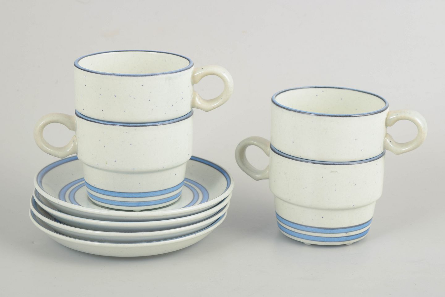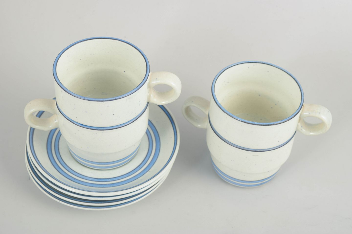 Stig Lindberg for Gustavsberg, kaffesæt.Sæt med fire kaffekopper med tilhørende underkopper i fajance fra “Dart”-serien. Enkle cylindriske former med let udadbøjet hank og diskret dekoration i blå linjer på lys bund, karakteristisk for Stig Lindbergs funktionelle og grafiske formsprog fra perioden.