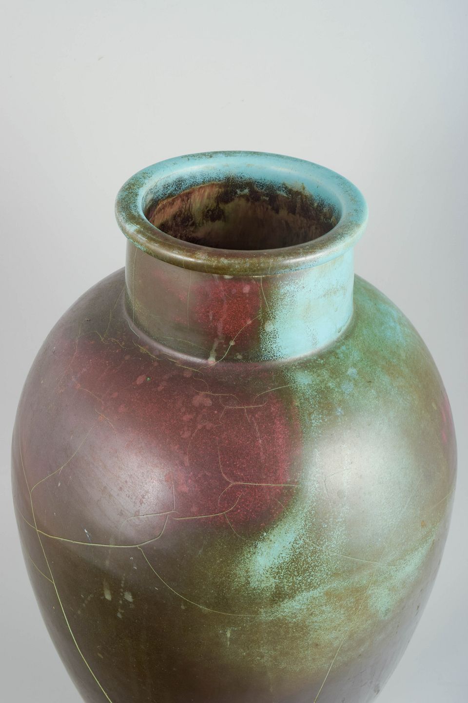 Richard Uhlmeyer, monumental gulvvase.Monumental, balusterformet gulvvase i keramik med dyb, iriserende overflade i mørke grønlige og vinrøde toner. Den høje, slanke silhuet og den markante hals giver et elegant Art Deco-præg.