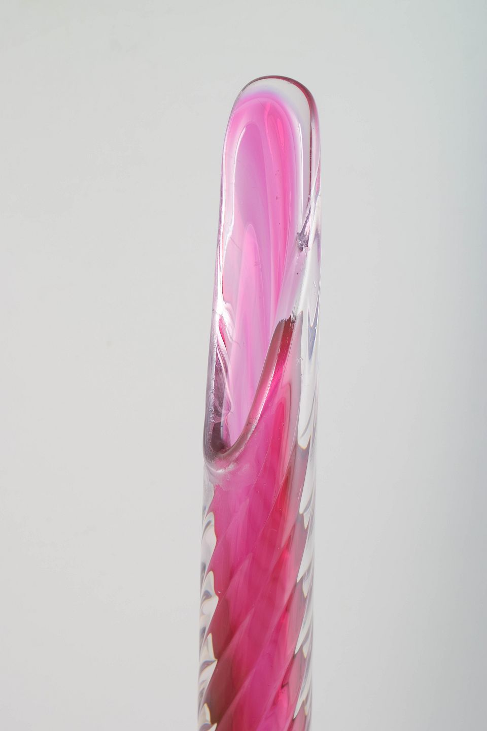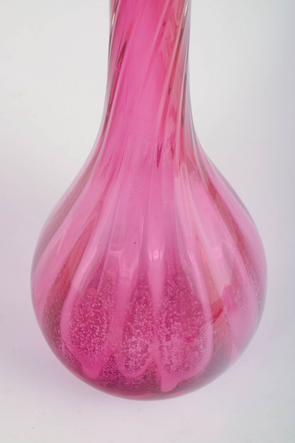 Murano, monumental vase.Høj, mundblæst glasvase med slank, opadstrakt hals og dråbeformet korpus. Udført i transparent rosa glas med elegante, snoede optiske striber og let fortykning i bunden, typisk for Murano-produktion fra midten af det 20. århundrede.