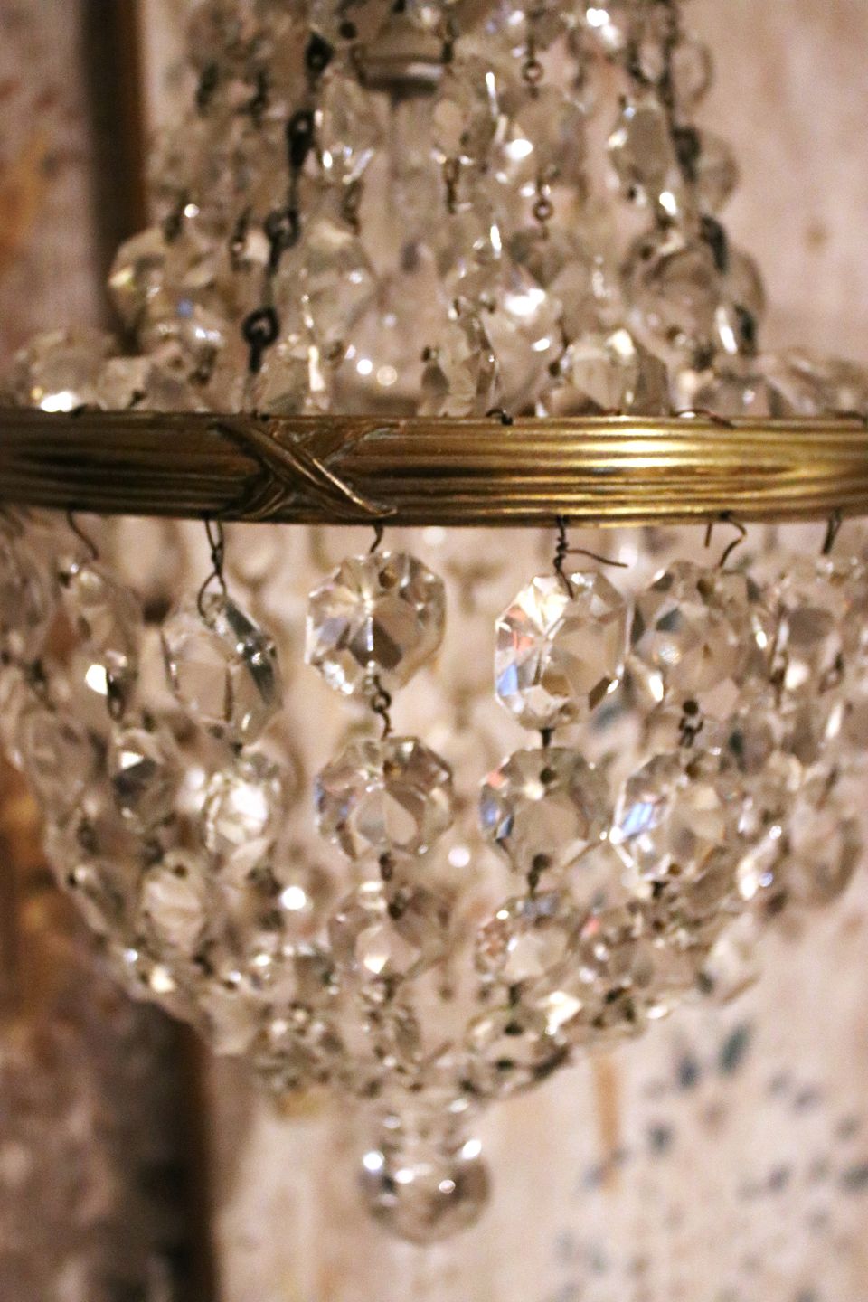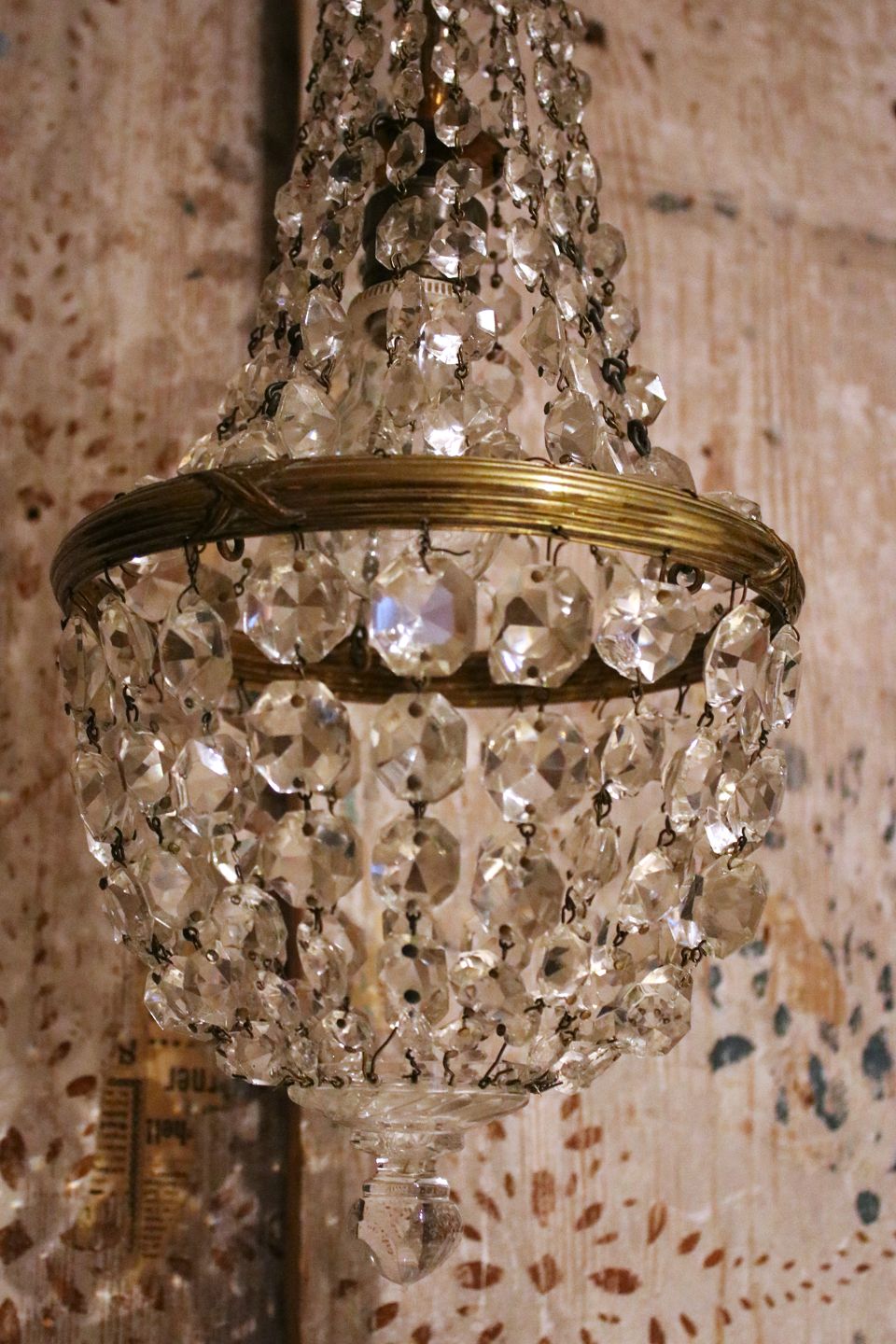 Gammel , mini prismelysekrone i bronze med klare slebne glas prismer.Lysekronen har en lyskilde i midten og er monteret med ny stofledning.