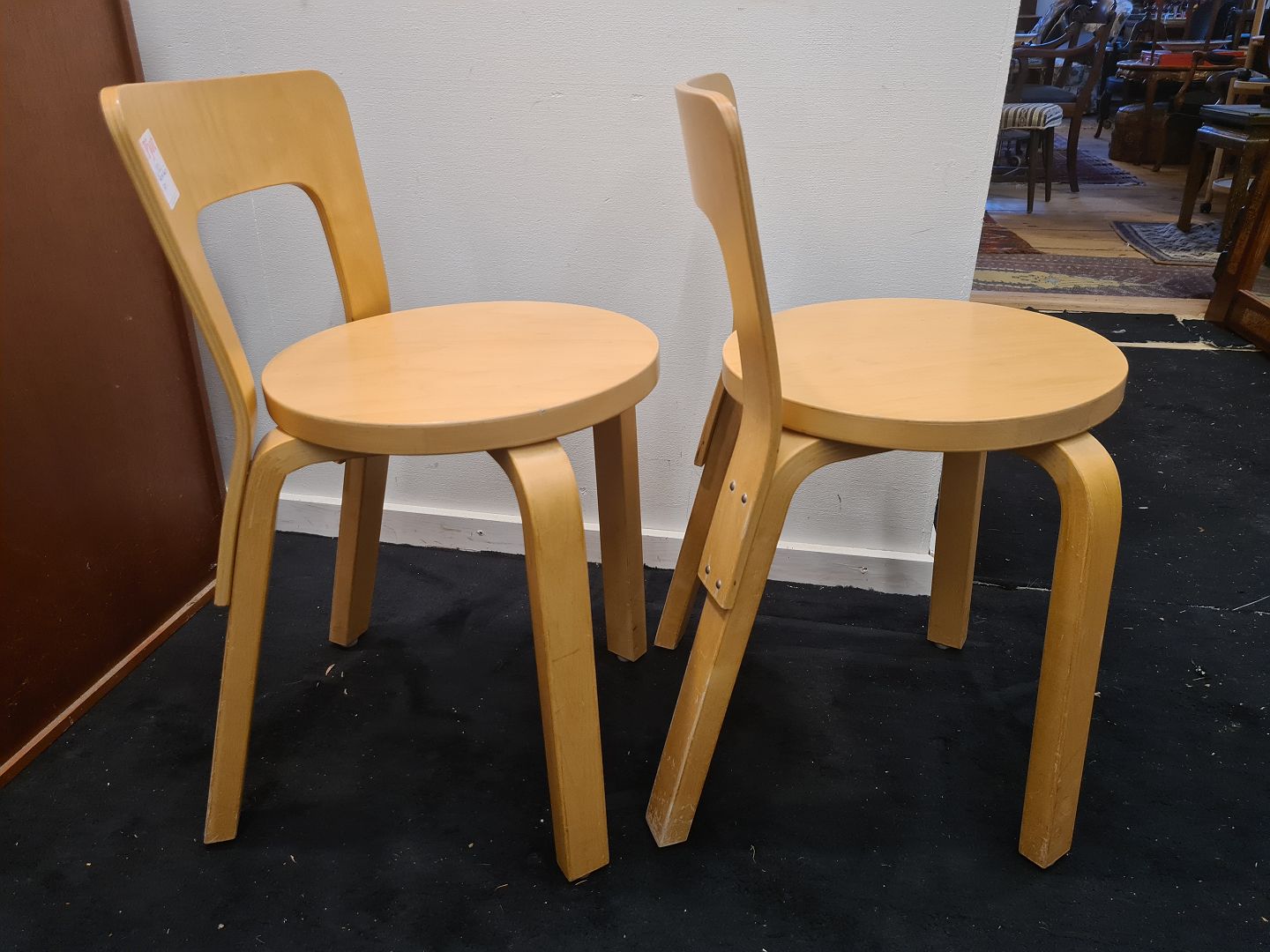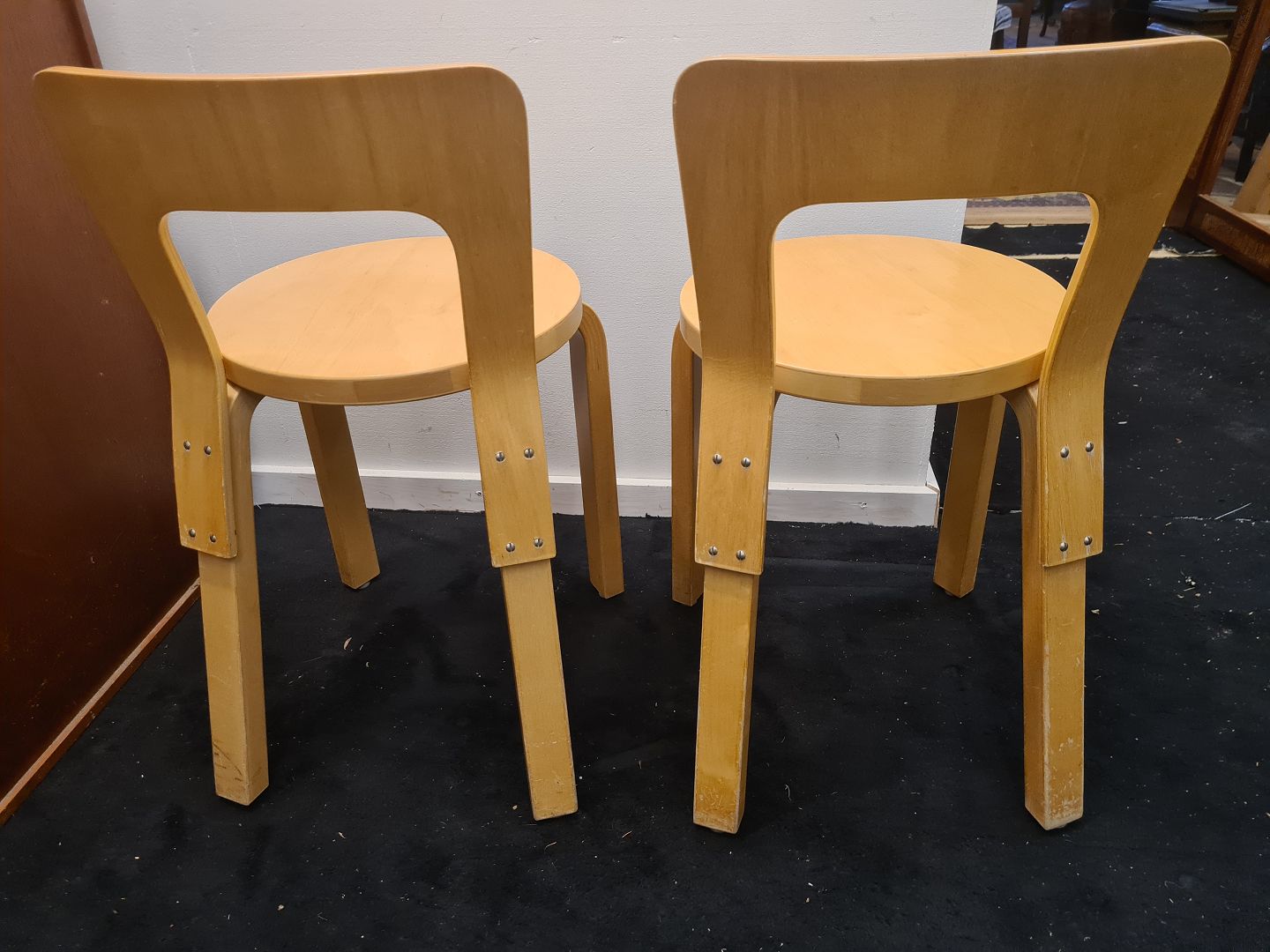 Par Alvar Aalto stole model 65 i bøg. Fremstår pæne og stabile uden de store brugsspor. Højde 66 cm. Bredde 35 cm. Dybde 38 cm.