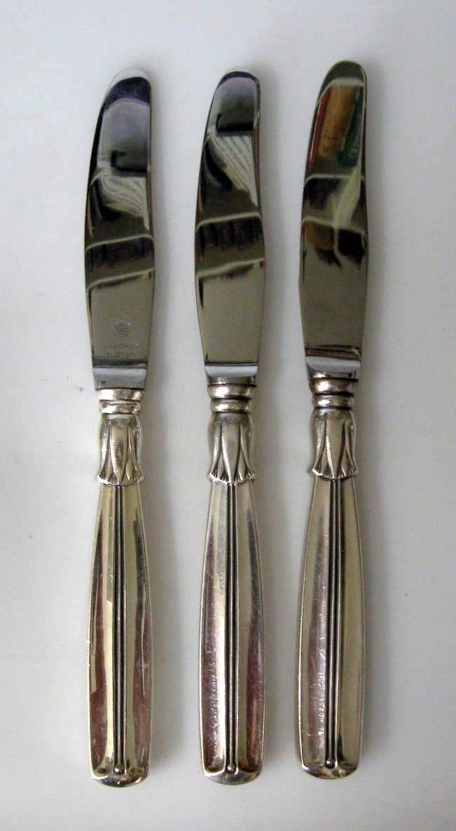 Lotus-Silberbesteck, Horsens Silverware Factory, ca. 1940.Messer. Länge: 22 cm. Mit Raadvad-Klinge. Gestempelt 830 s. Pt. Stückzahl: 25 Stück auf Lager. Preis pro Stück: 350,- kr.