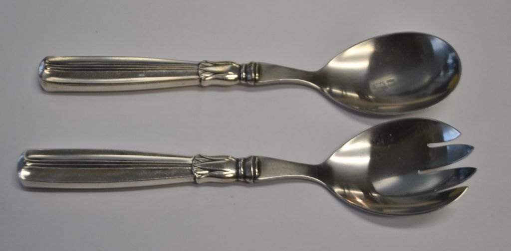 Salatbesteck, 2-teilig, aus Stahl. Länge: 18 cm. 1 Set auf Lager. Gesamtpreis: 650,- kr.