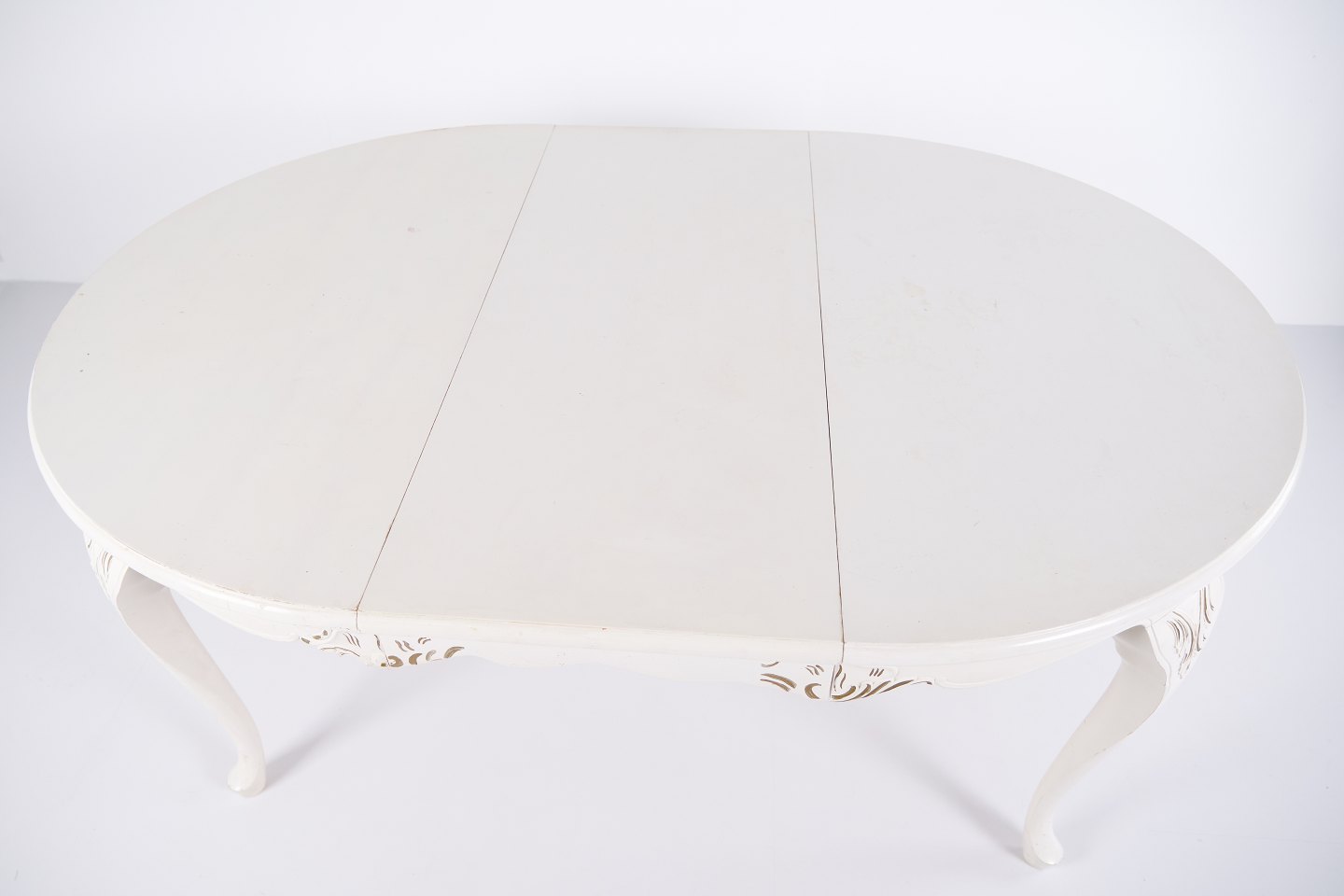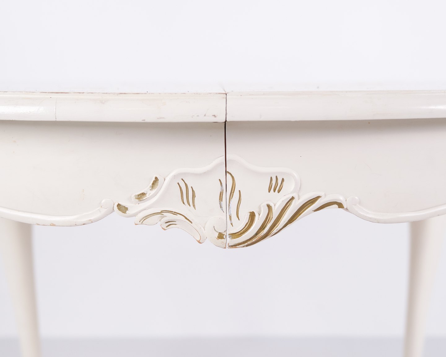 Antiker runder Esstisch im Neu-Rokoko Stil aus den 1920er Jahren. Weiß lackiert mit dekorativen Details und 4 Einlegeplatten.— Stil: Neu-Rokoko