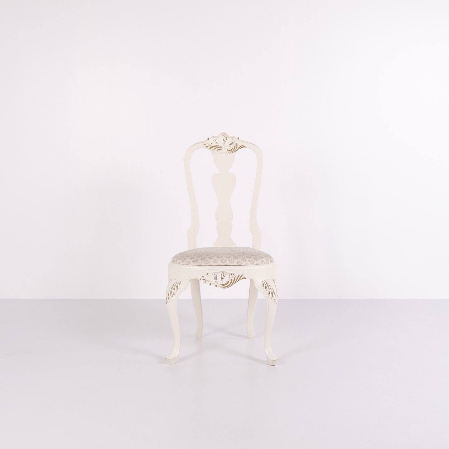 Antike Esszimmerstühle im Neu-Rokoko Stil aus den 1920er Jahren. Satz von 6 weiß lackierten Stühlen mit dekorativen Details.— Stil: Neu-Rokoko