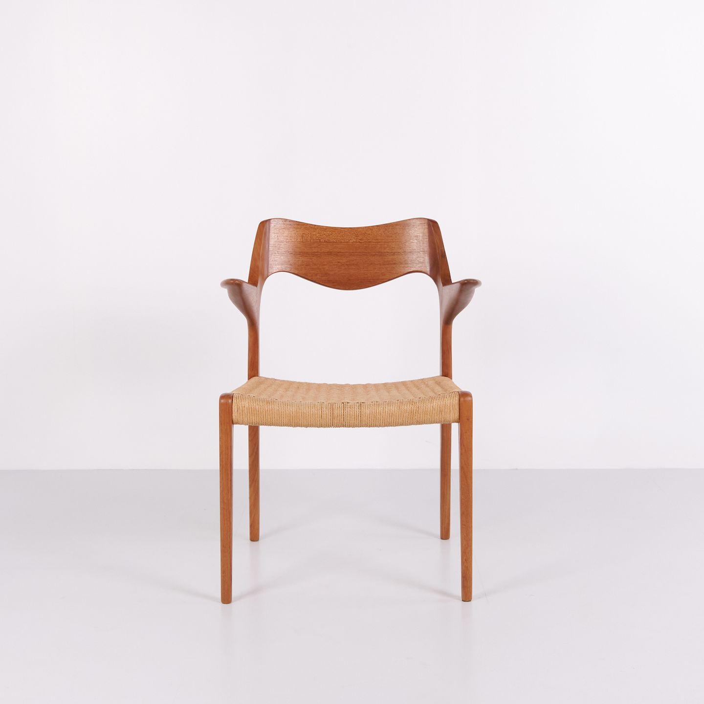 Modell 55 Esszimmerstuhl von N.O. Møller für J.L. Møllers Møbelfabrik in Teak und Geflecht aus den 1960er Jahren. Dänischer Designklassiker.— Designer: N.O. Møller