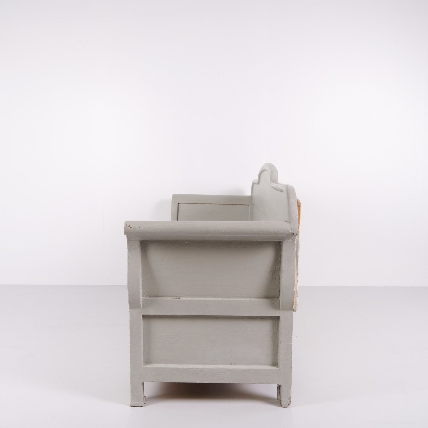 Antike Truhenbank aus den 1890er Jahren aus grau lackiertem Kiefernholz. Antike Aufbewahrungsbank aus dem 19. Jahrhundert.— Typ: Truhenbank mit Aufbewahrung