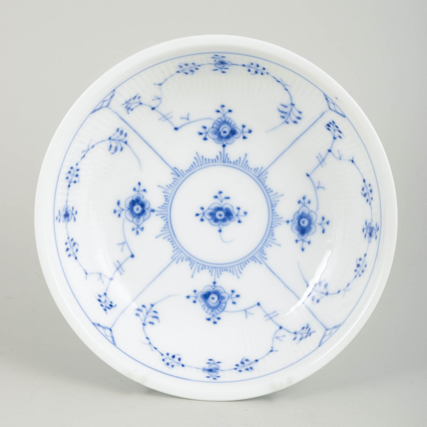 Musselmalet Riflet er Royal Copenhagens ældste og mest traditionsrige stel, introduceret i 1775. Dekorationen er inspireret af kinesisk porcelæn og udføres i frihåndsmalet koboltblåt underglasur, hvilket giver hvert enkelt stykke et individuelt præg. I 1920’erne blev stellet fortsat produceret i klassiske, funktionelle former med stor teknisk præcision og en sikker penselføring, som i dag gør disse genstande eftertragtede blandt samlere.