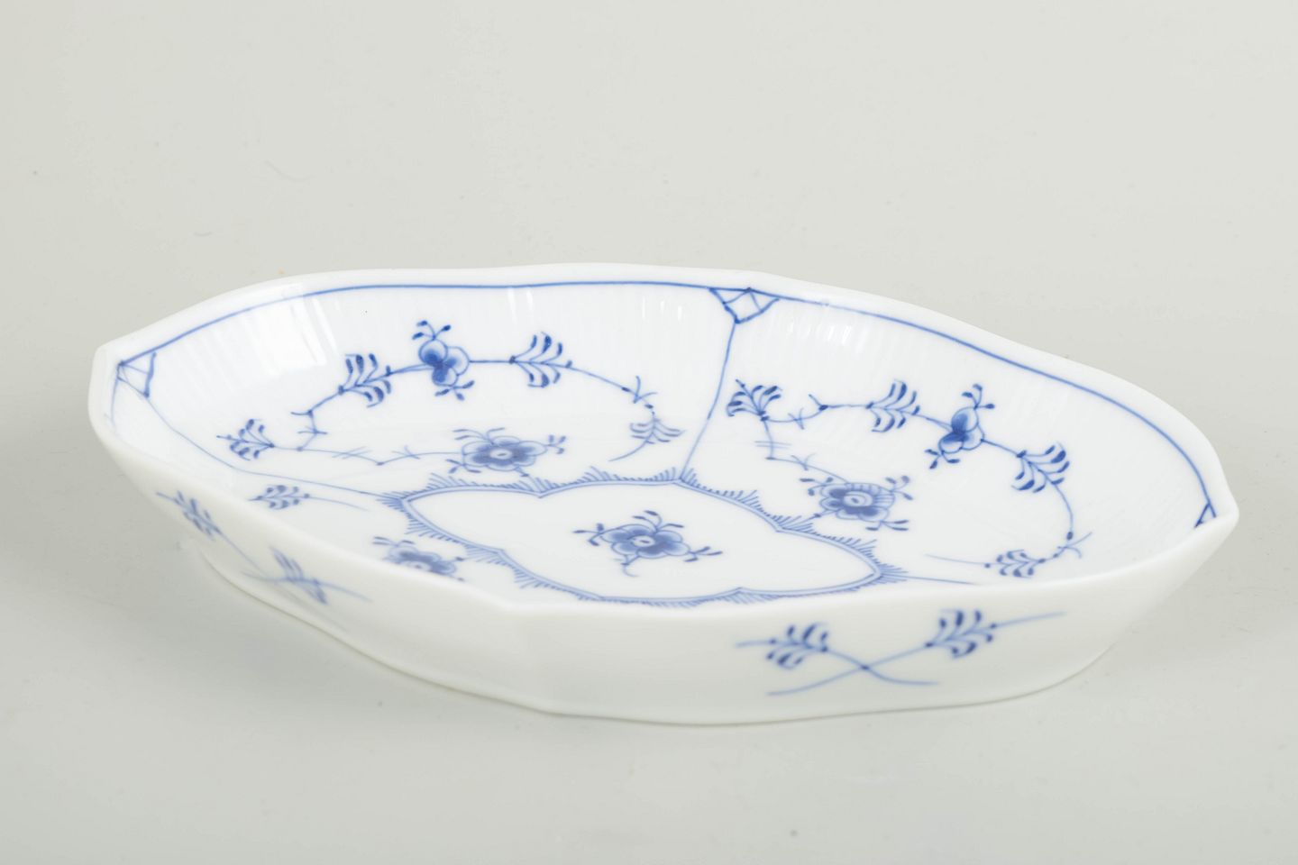 Ovalt porcelænsfad dekoreret med håndmalet koboltblåt underglasur i det klassiske Musselmalet Riflet mønster. Modellen er 1/147 og kendetegnes ved den let facetterede, blødt svungne form med profileret rand og opdelt spejl, rigt udsmykket med blomster- og rankemotiver. Et elegant eksempel på Royal Copenhagens forfinede porcelænskunst fra mellemkrigstiden.