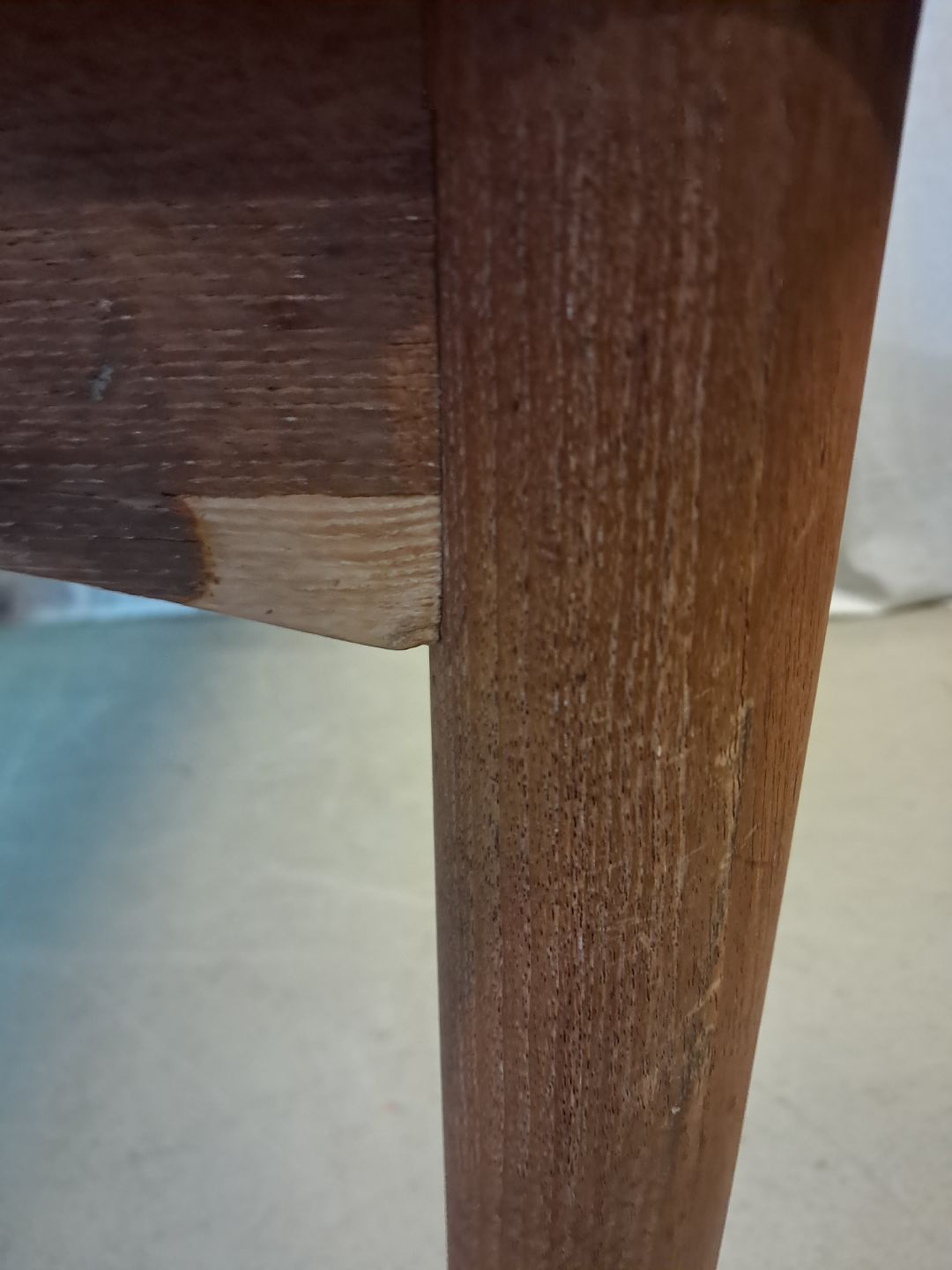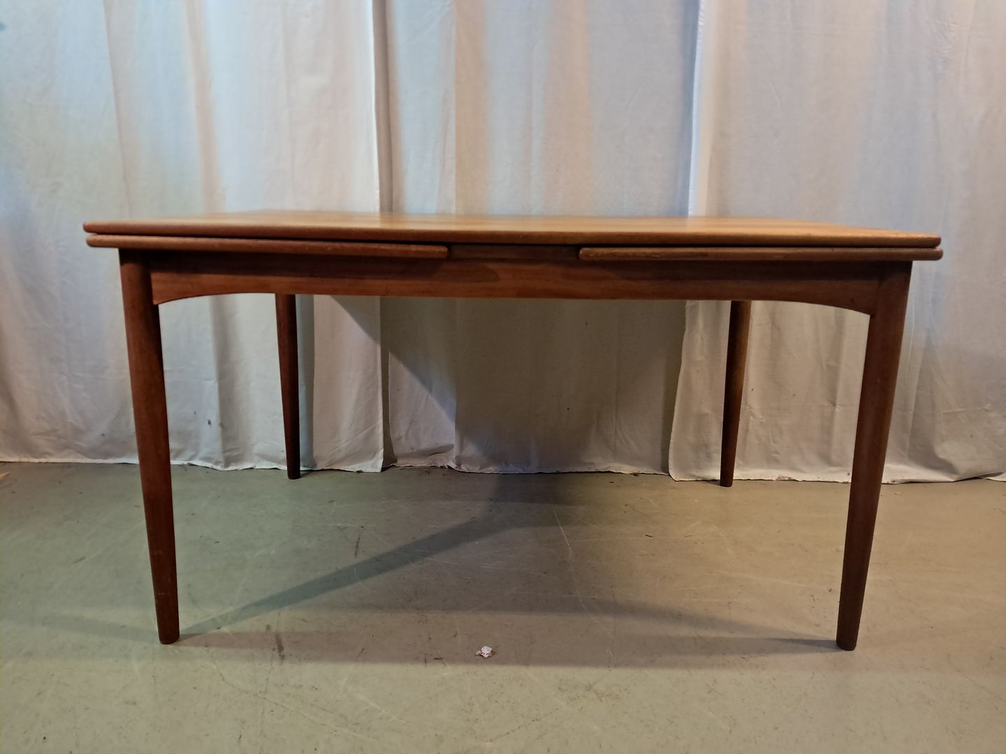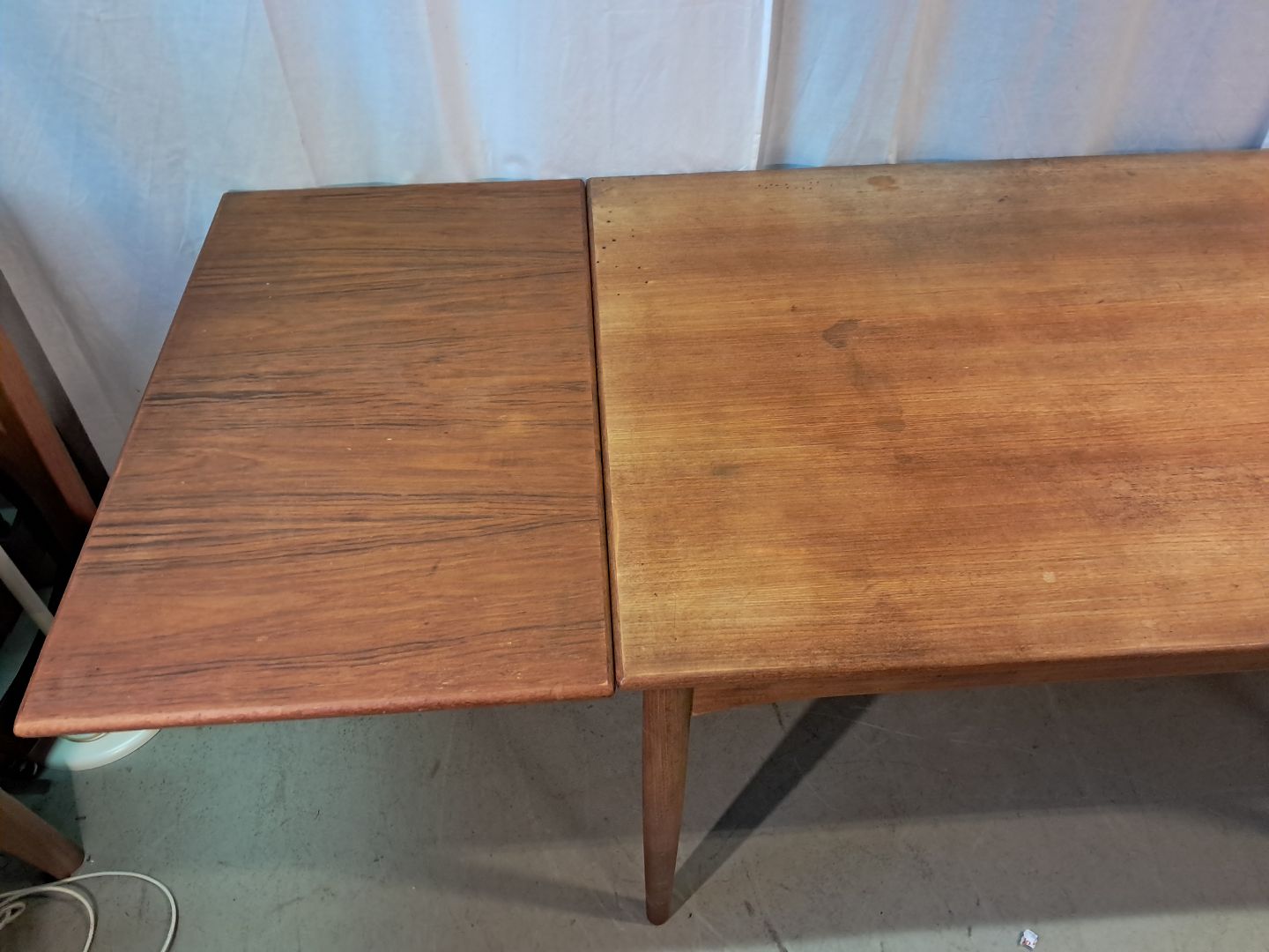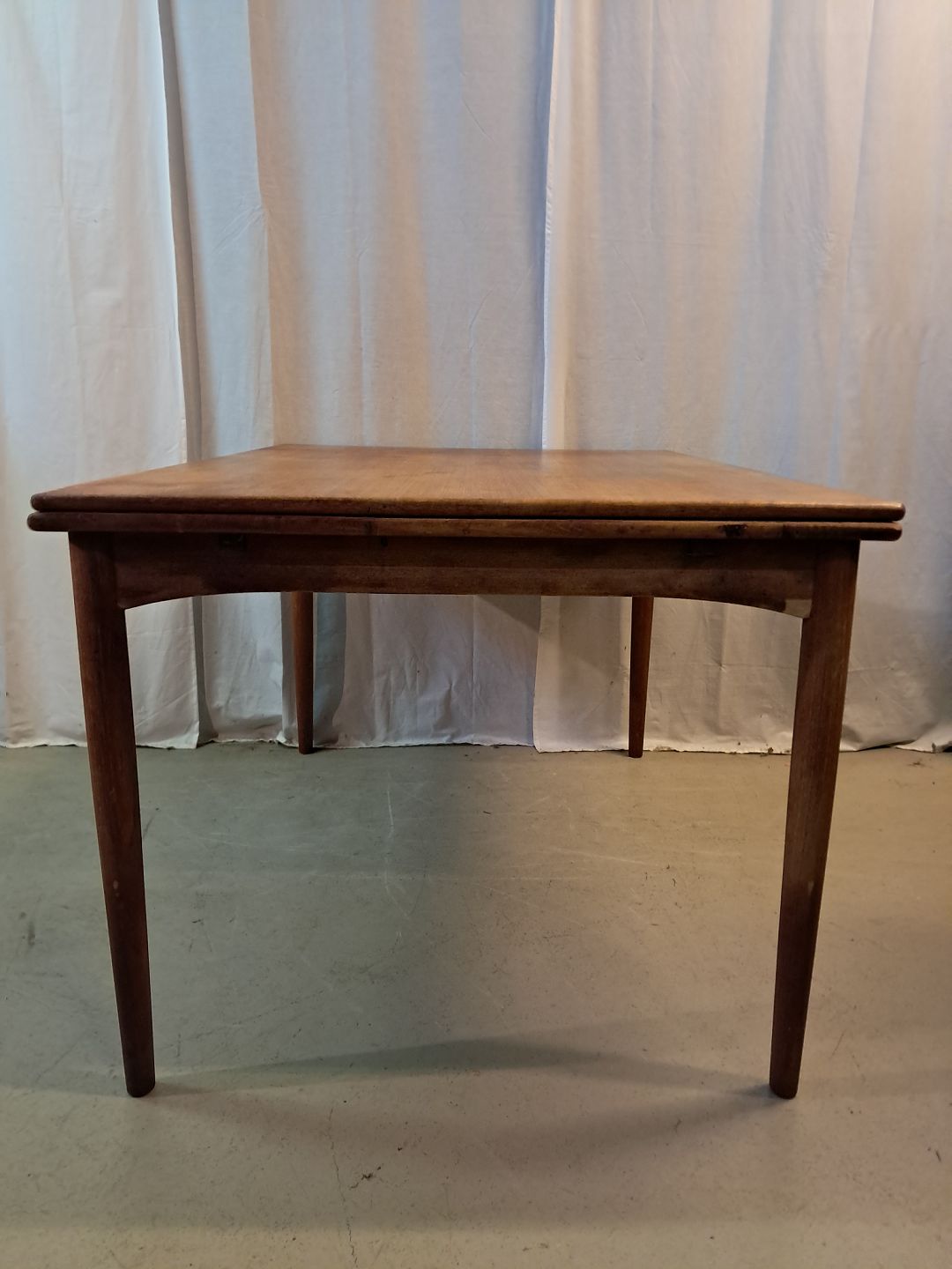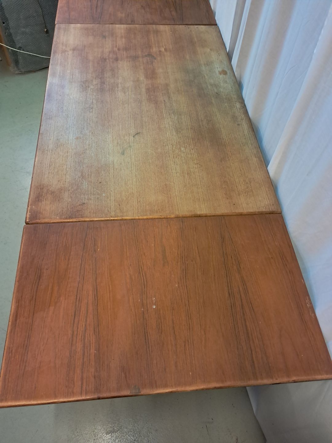 Spisebord i fineret teaktræ med hollandsk udtræk, fra 1960erne.Det har brugsspor og finer defekt.