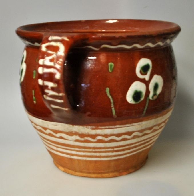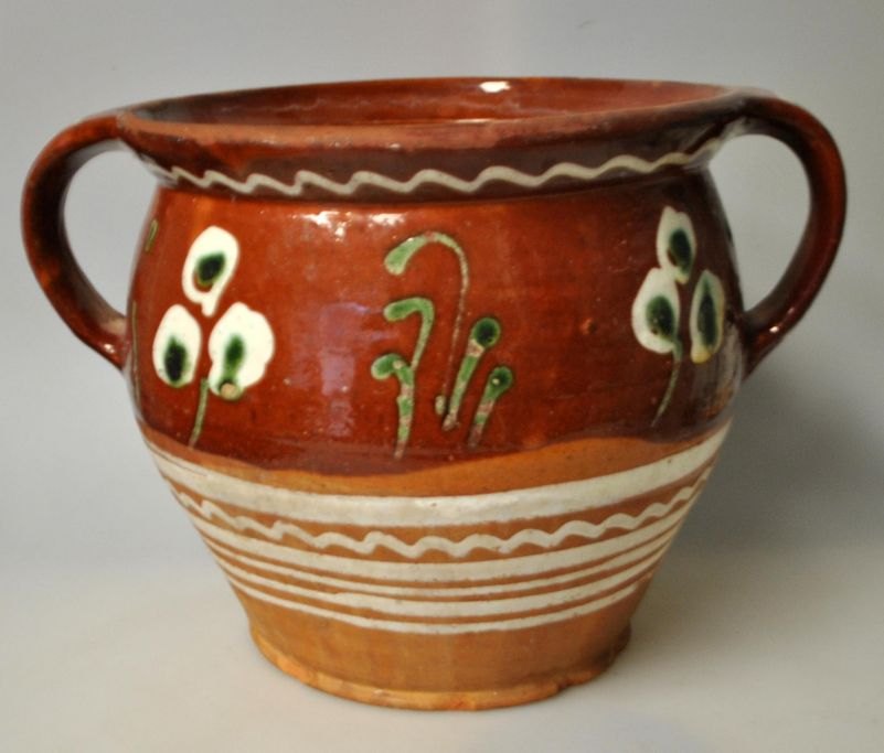 Zweihenkeliges Gefäß mit braunem Außenüberzug, Sorring, um 1870, Dänemark. Mit Blumen verziert. Höhe: 18 cm. Durchmesser: 20 cm.