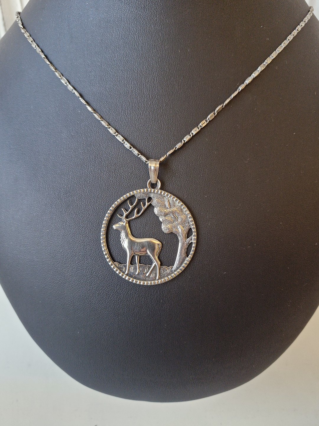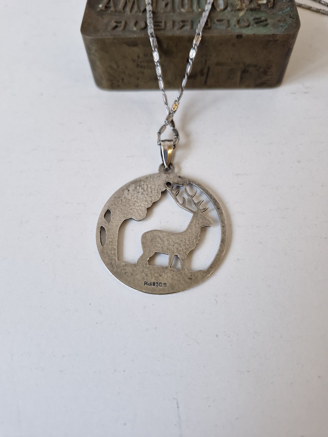 Halskæde og vedhæng i sølv, vedhænget er udformet som skovparti med krondyrStemplet: H.J - 830s