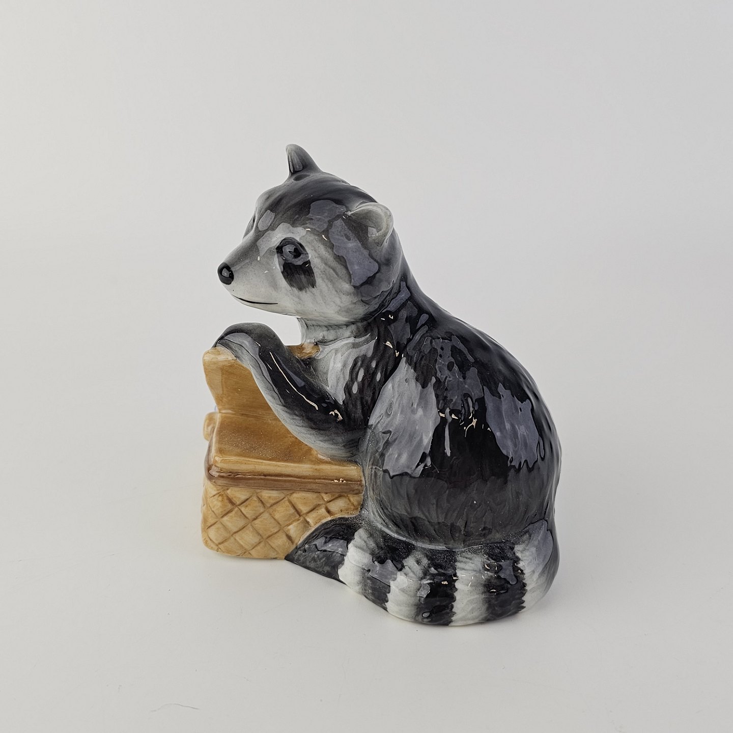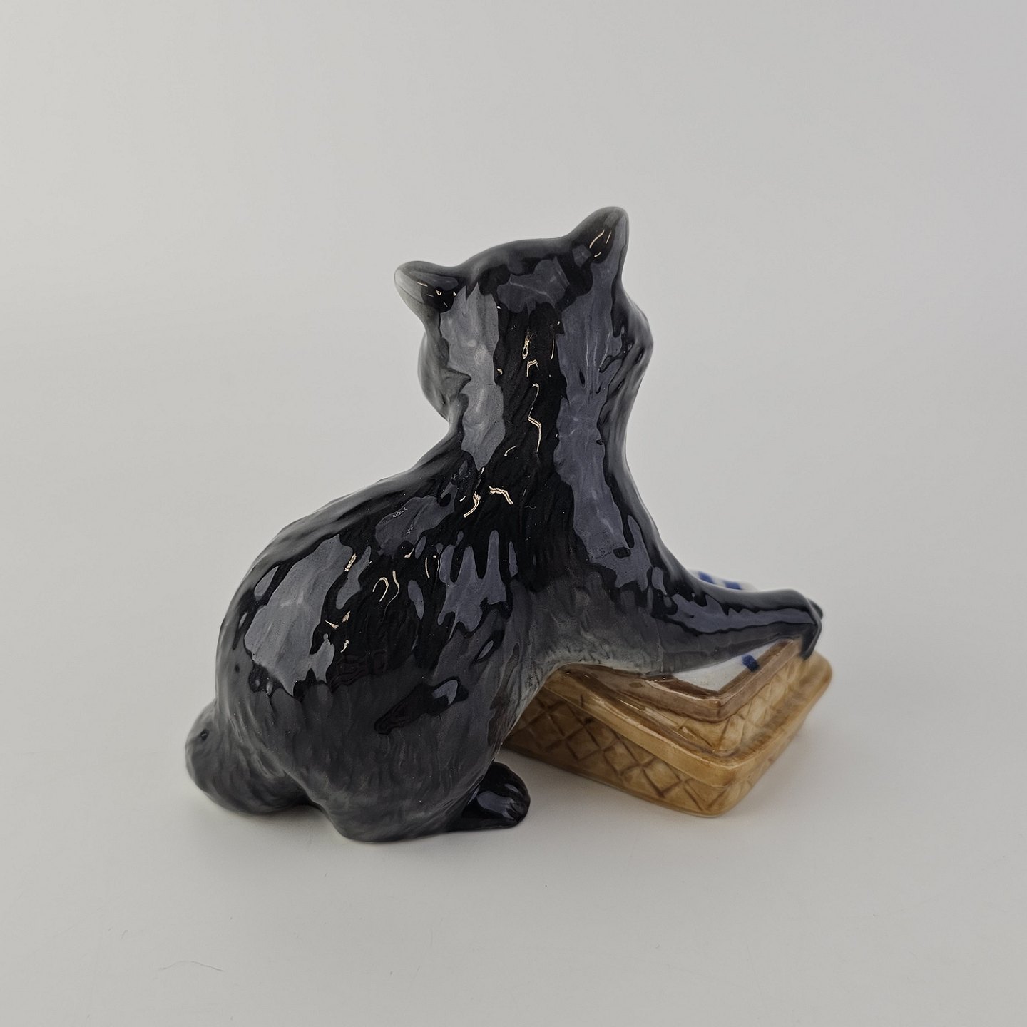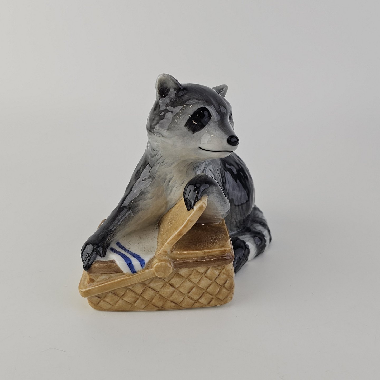 Figur i kongeligt porcelæn med motiv af en vaskebjørn med en picnickurv Nr. 055