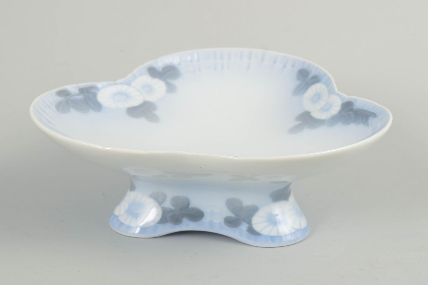 Lav fodskål i porcelæn fra serien Skærsommernatsdrøm, model 73/10032. Skålen har en blødt svungen form med lav fod og dekoration i afdæmpede blå nuancer.