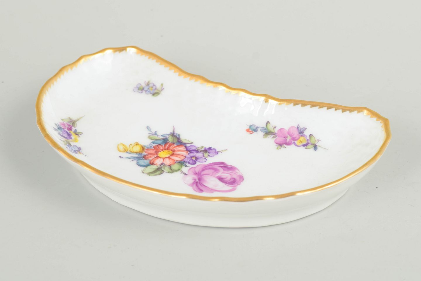 Royal Copenhagen, Saksisk Blomst fad.Buet fad i hvidglaseret porcelæn med håndmalet blomsterdekoration i serien Saksisk Blomst, indrammet af forgyldt kant; model 4/1466. 1. sortering, ca. 1910’erne.
