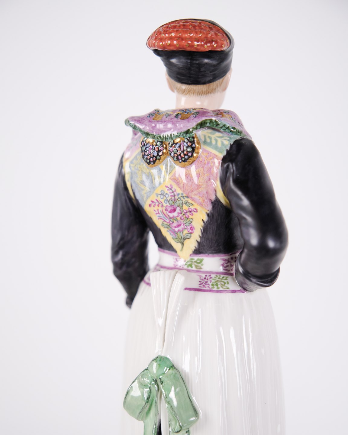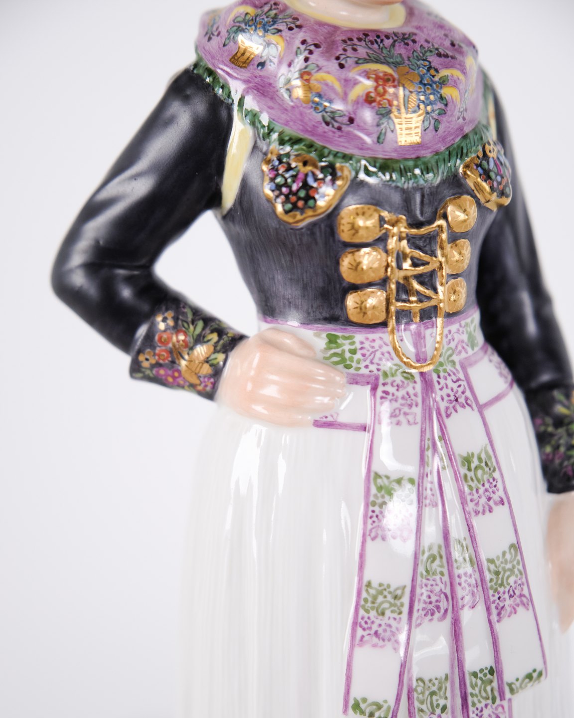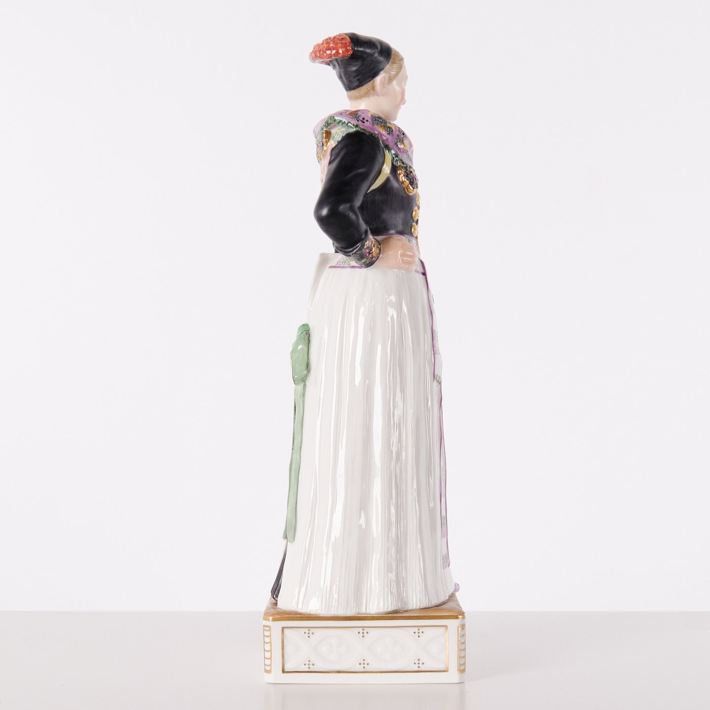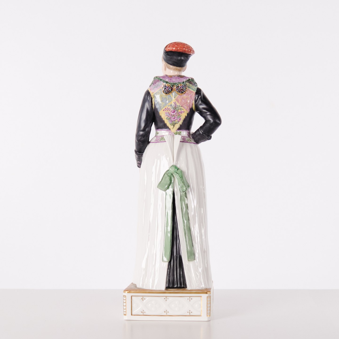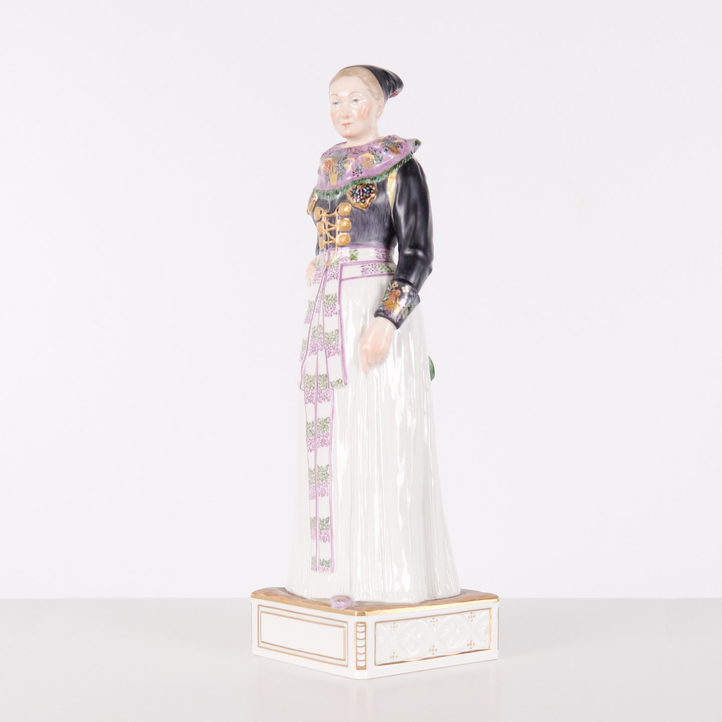 Überglasur-Porzellanfigur in dänischer Nationaltracht, Modell 12104, mit Darstellung einer Kochtracht aus Amager. Entworfen von Carl Martin-Hansen (1877–1941) für Royal Copenhagen und Teil der Serie Dänische Nationaltrachten.Die Serie umfasst insgesamt 47 Figuren und wurde im Zeitraum 1906–1925 produziert. Carl Martin-Hansen war für seine Figuren, Büsten und öffentlichen Denkmäler bekannt und gehörte zur naturalistischen Tradition der dänischen Kunst um die Jahrhundertwende. Die Serie der dänischen Nationaltrachten gilt als eines seiner bedeutendsten Werke für Royal Copenhagen und zeichnet sich durch eine detailreiche und präzise Wiedergabe regionaler Trachten aus.