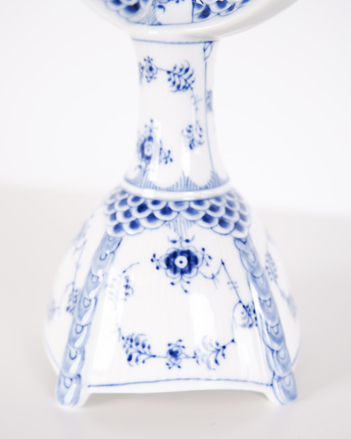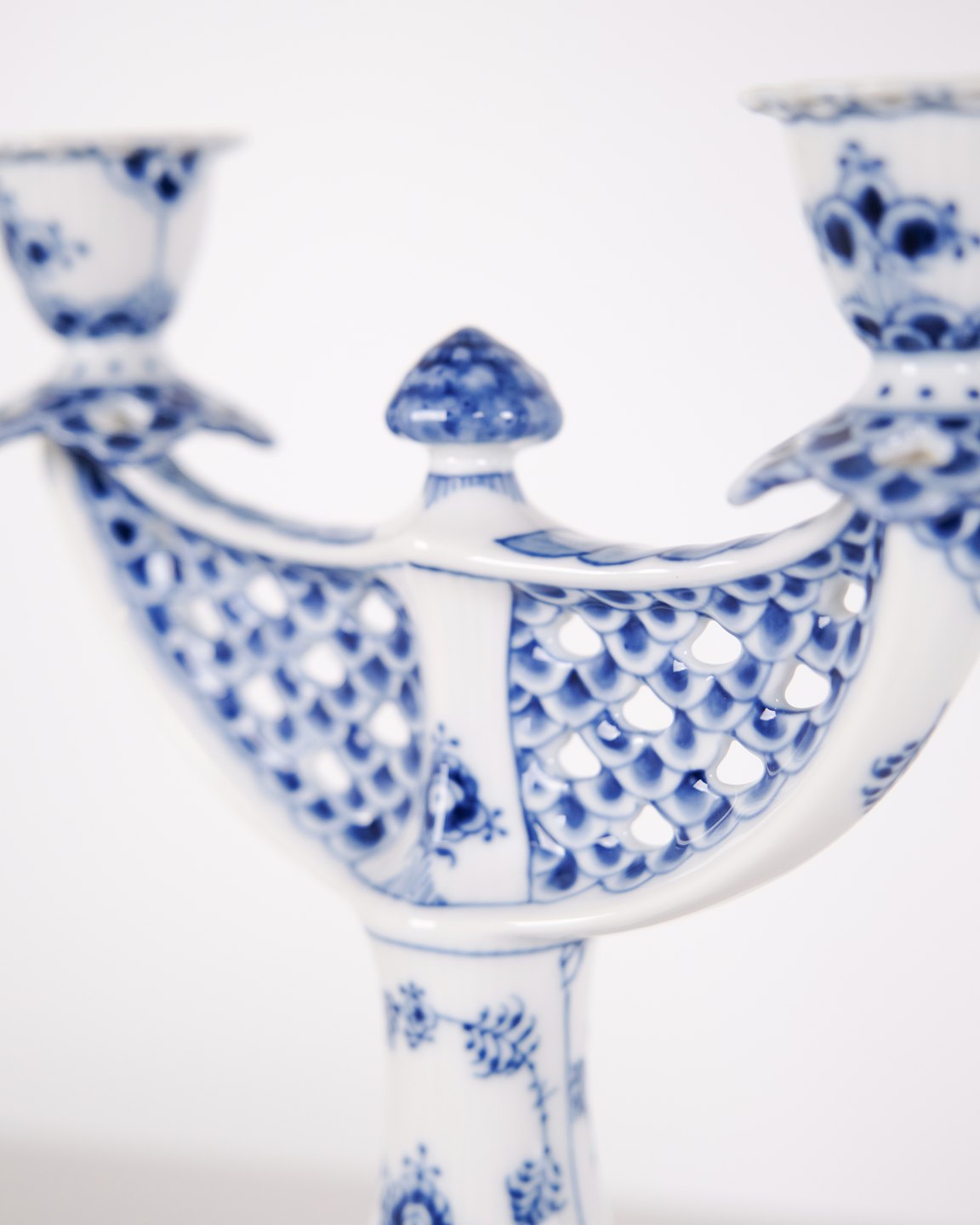 Zweiarmiger Kerzenleuchter aus Porzellan mit Musselmalet Vollspitze, Modell 1169, hergestellt von Royal Copenhagen. Handbemaltes Porzellan mit charakteristischem durchbrochenem Spitzenrand und Unterglasurdekoration. Als 1. Wahl gefertigt und Teil der klassischen Serviceproduktion von Royal Copenhagen.— Hersteller: Royal Copenhagen