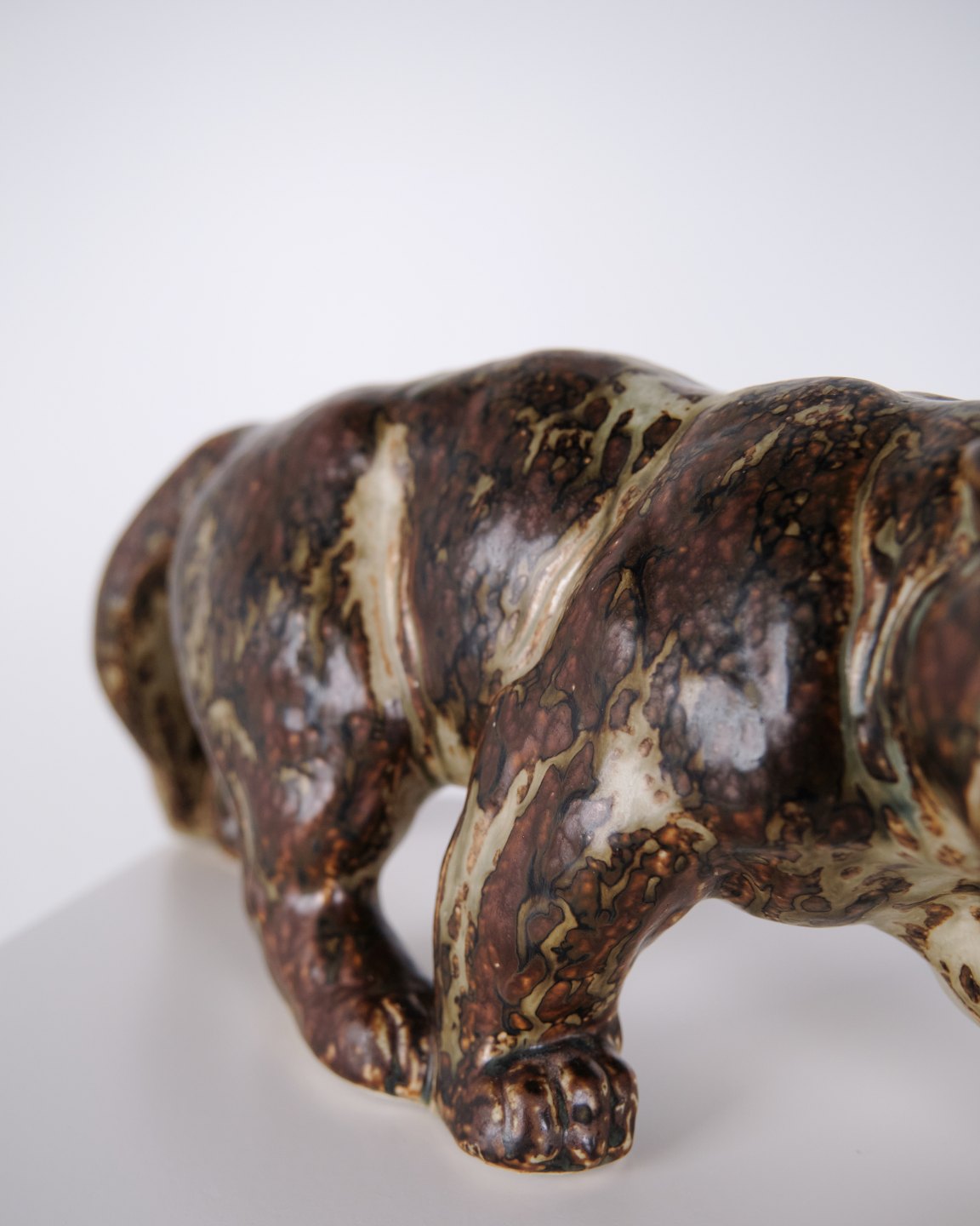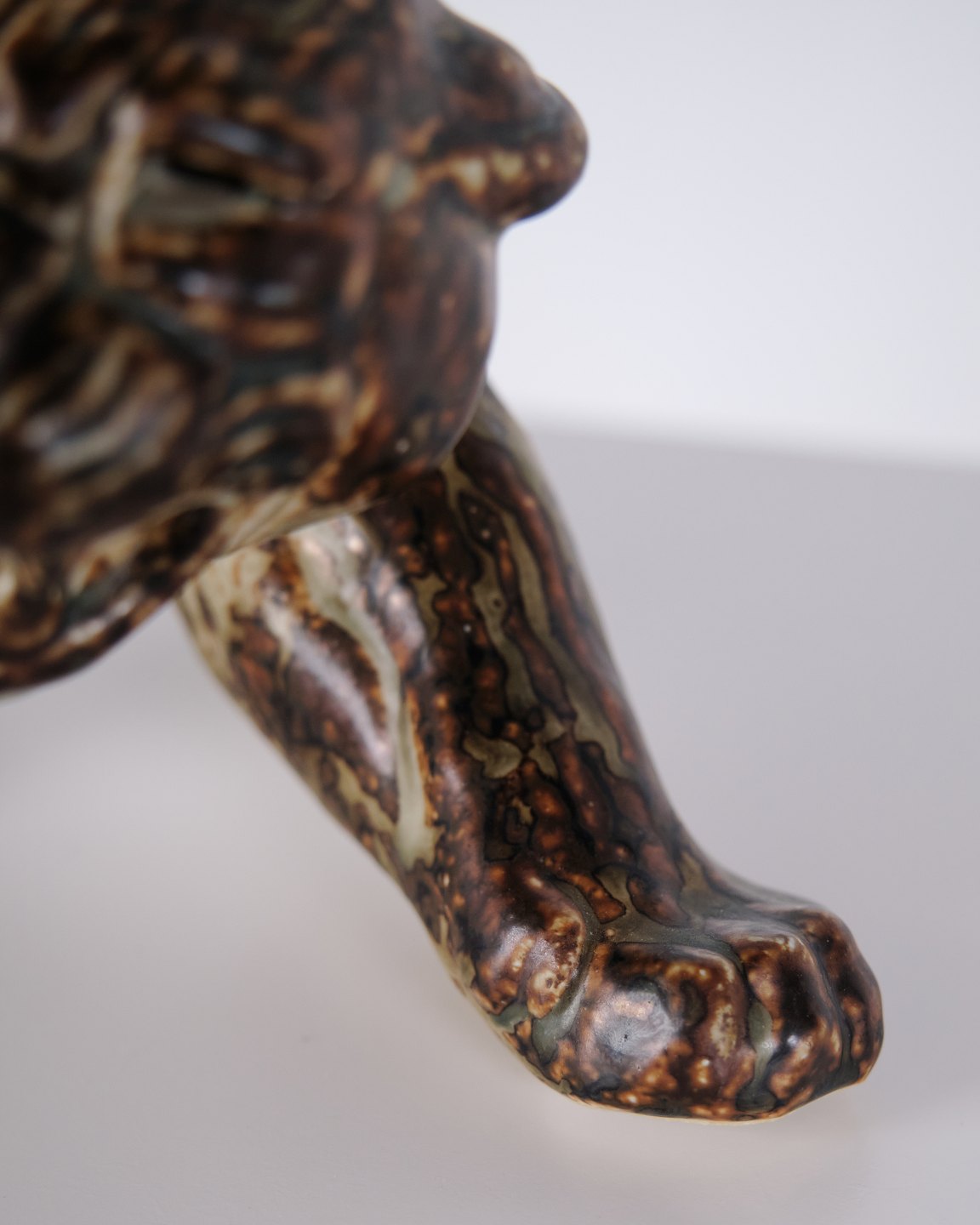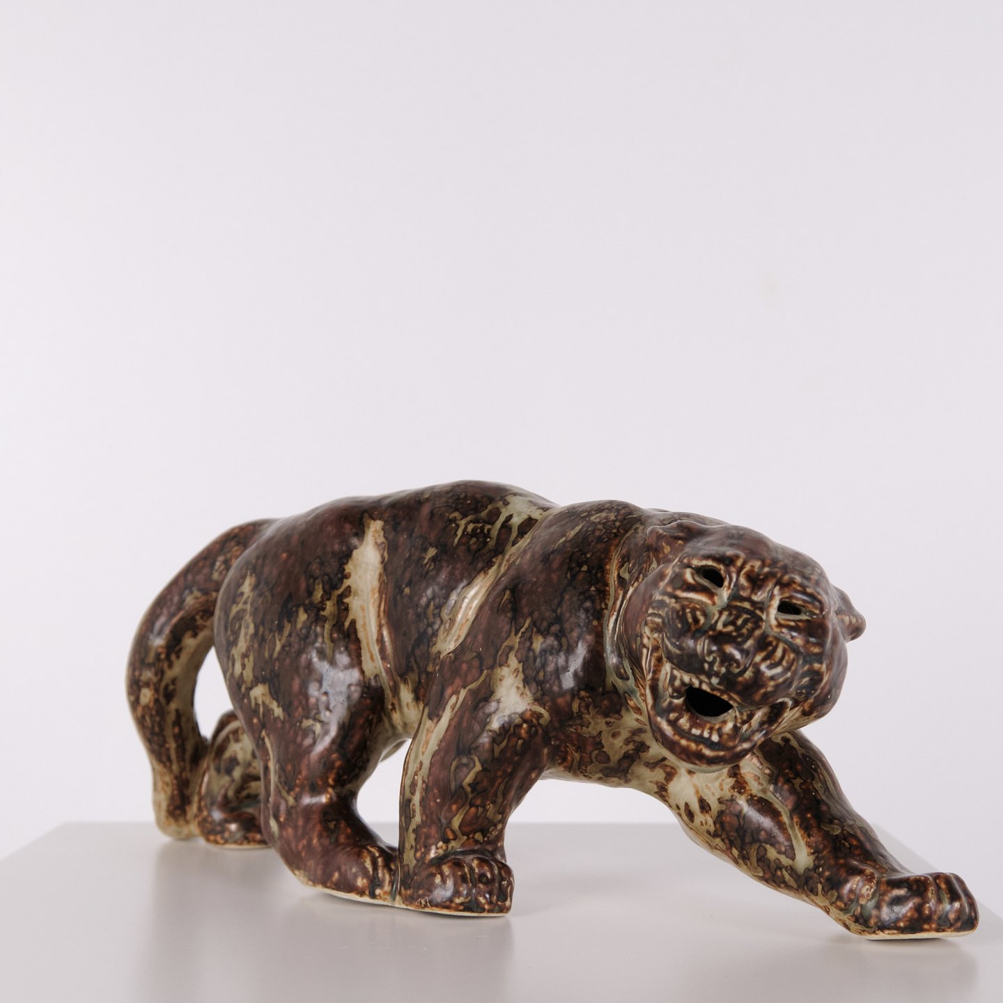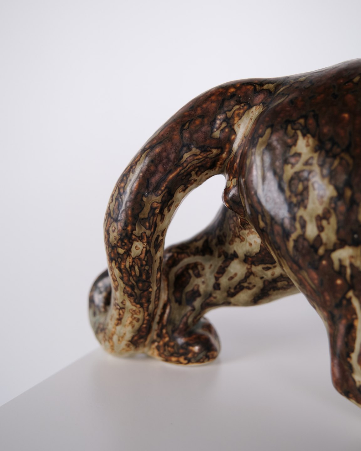 Steinzeugfigur mit Panthermotiv, Modell 20283, entworfen von Knud Kyhn für Royal Copenhagen. Die Figur wurde aus Steinzeug gefertigt und gehört zu Knud Kyhns Tierdarstellungen, die bei Royal Copenhagen produziert wurden und dem dänischen Keramikdesign des 20. Jahrhunderts zuzuordnen sind.— Designer: Knud Kyhn