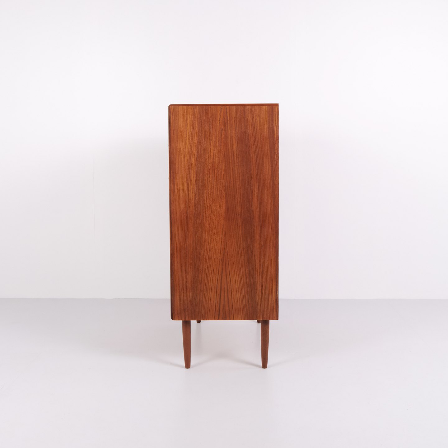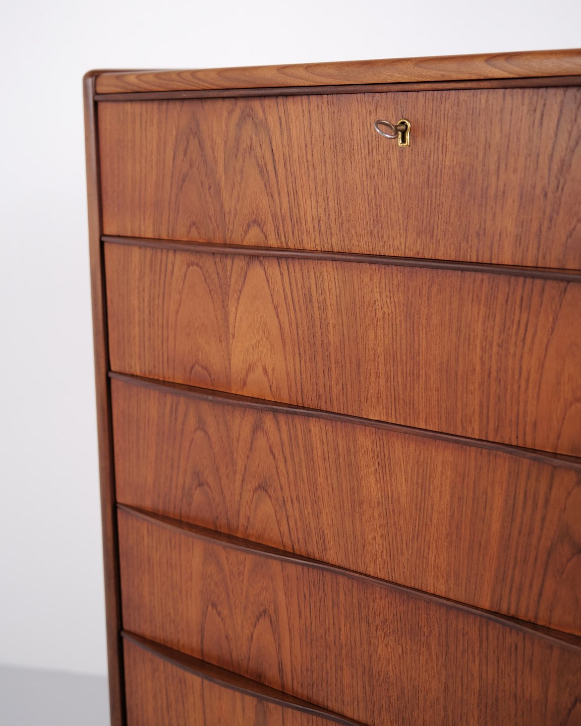 Kommode aus Teakholz mit sechs Schubladen und originalen Griffen. Das Möbelstück ist ein Beispiel für dänisches Möbeldesign der 1950er-Jahre mit Fokus auf Funktionalität, Stauraum und Materialqualität. Durch die hohe Form eignet sich die Kommode für Schlafzimmer, Flur oder Wohnbereich.— Material: Teakholz
