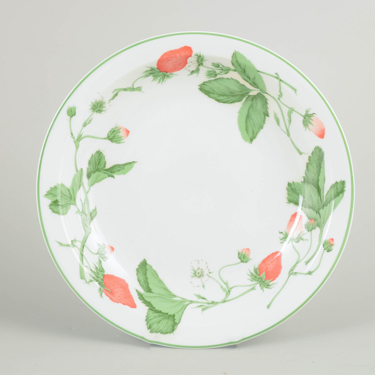 Stor rund skål i porcelæn med dekoration af jordbær og blade langs kanten i serien Fraise.
