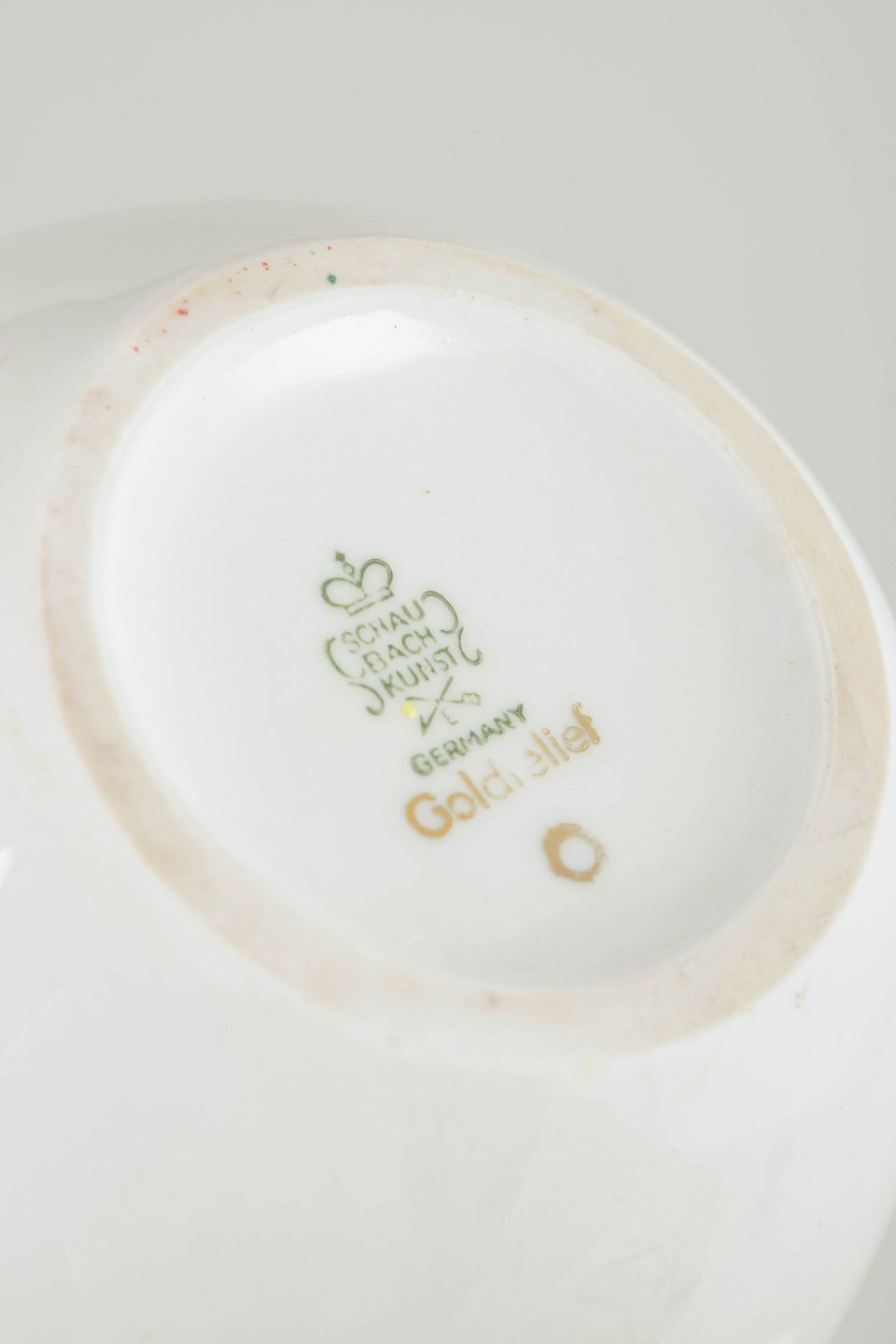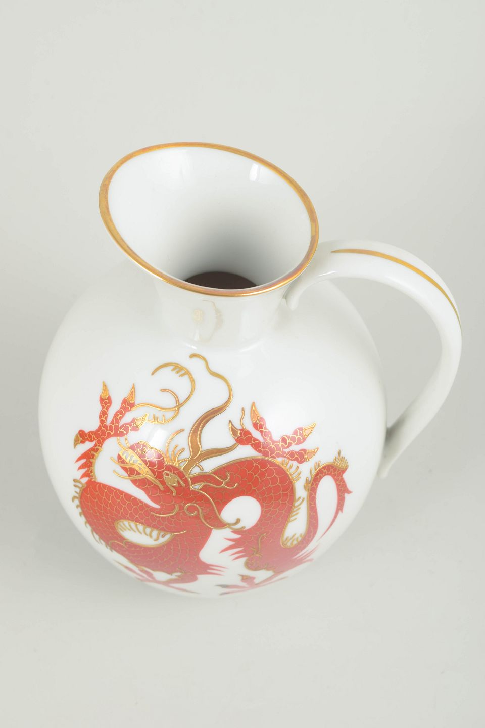 Schaubach Germany, kande med Mingdrage.Balusterformet kande i hvidglaseret porcelæn dekoreret med rød Mingdrage og forgyldt kant. Modellen er mærket Schaubach Germany og Gold Plated under bunden.