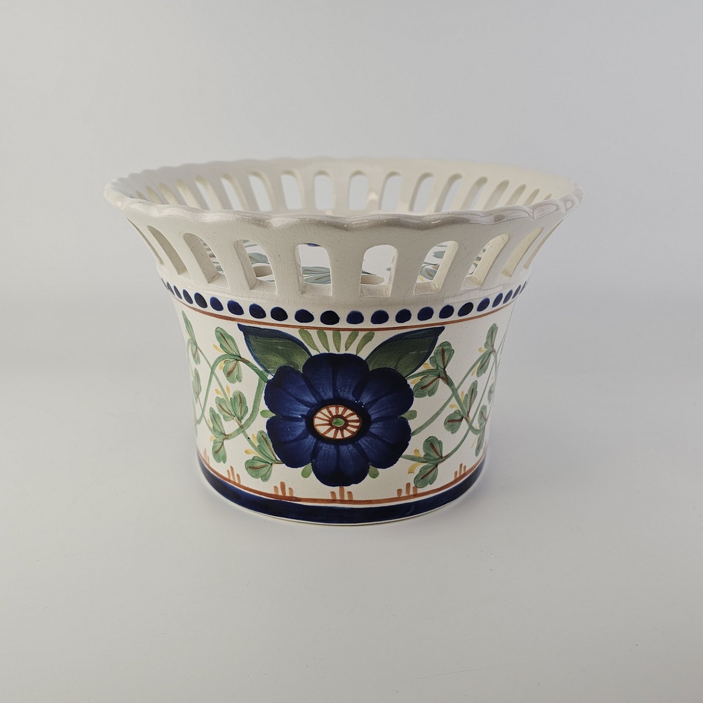 Oval jardiniere med låg i fajance med dekoration af en blå blomst og grønne blade. Nr. 1042/720Producent Aluminia