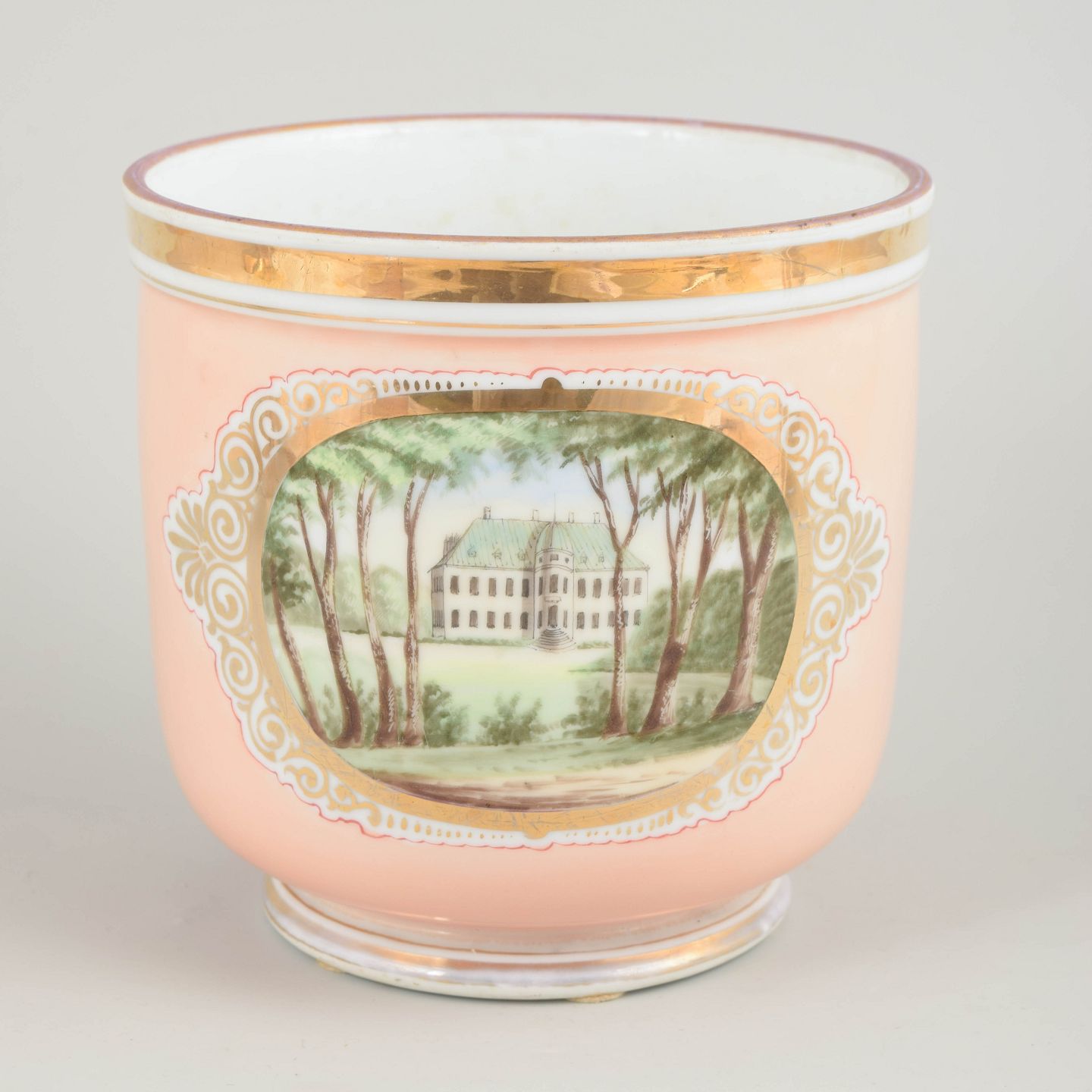 Dansk vase med motiv af Bernstorff Slot og Kronborg slot, håndmalet.Rund, let konisk vase i porcelæn med opaliserende rosa bundfarve og håndmalet prospekt af Bernstorff Slot og Kronborg slot i parklandskab med høje træer i forgrunden, indrammet af et ornamenteret felt og forgyldt bort langs randen. Klassicistisk inspireret form med lav fodring. Motivet er udført i bløde grønne og jordfarver med let idealiseret arkitektonisk gengivelse.