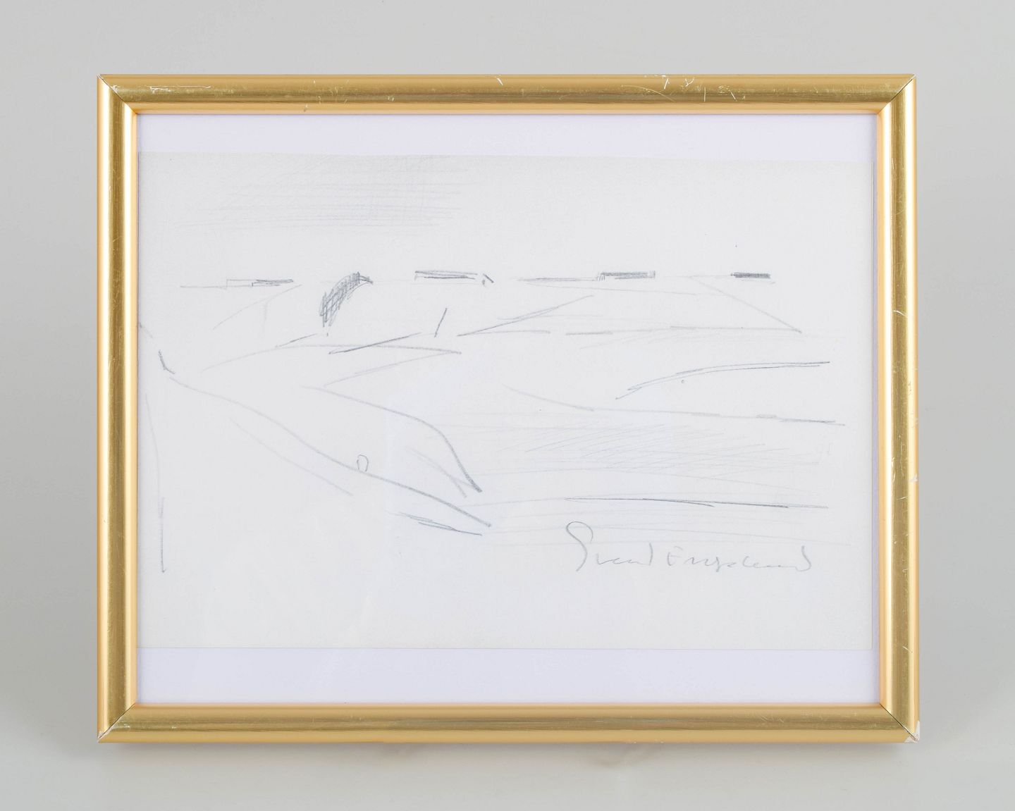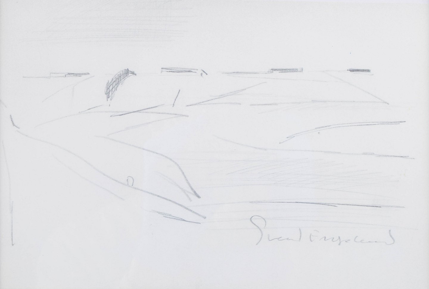 Svend Engelund, tegning, dansk billedkunstner.Dansk landskabsmotiv udført som blyantstegning med let abstraheret komposition og rolige, horisontale linjer.