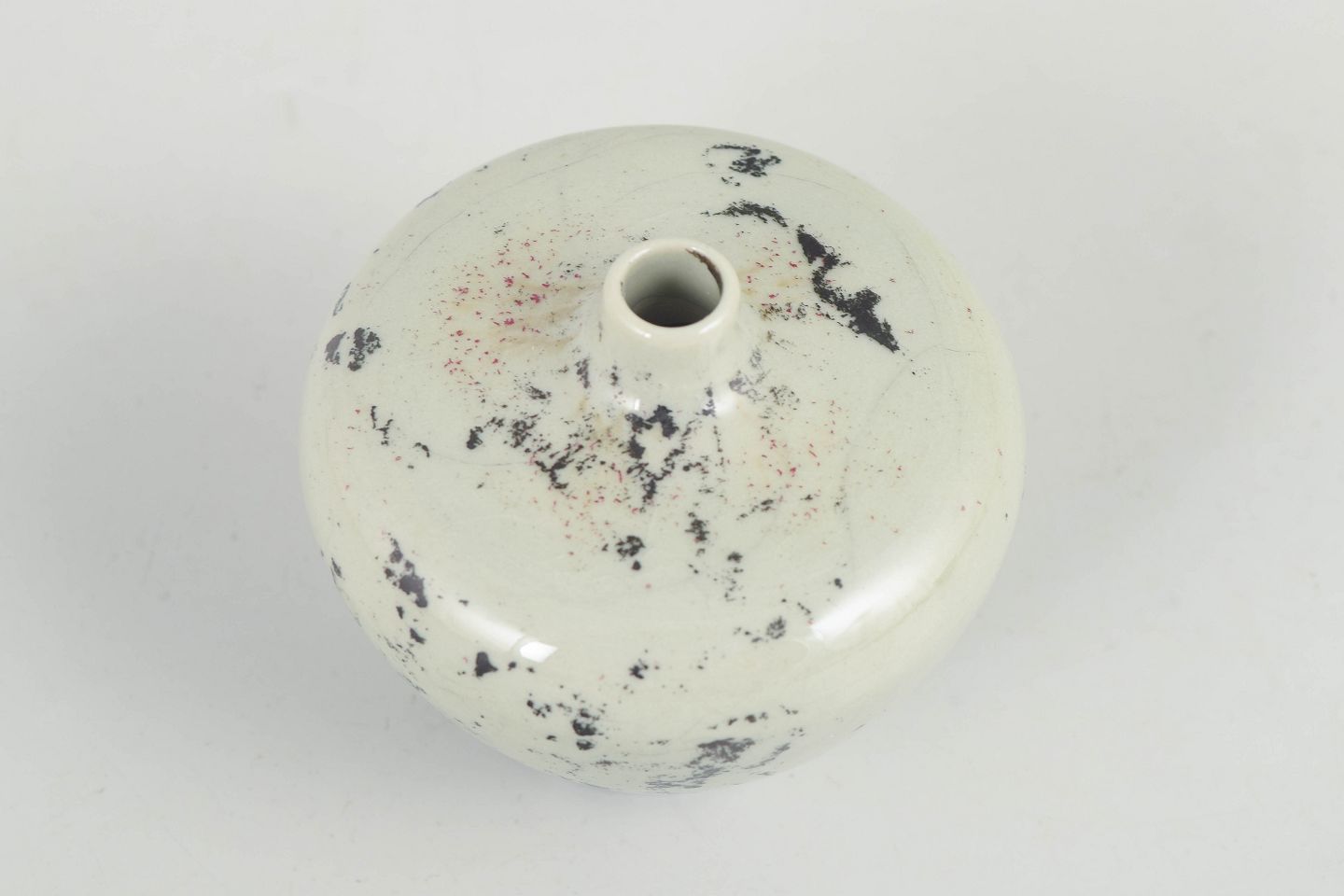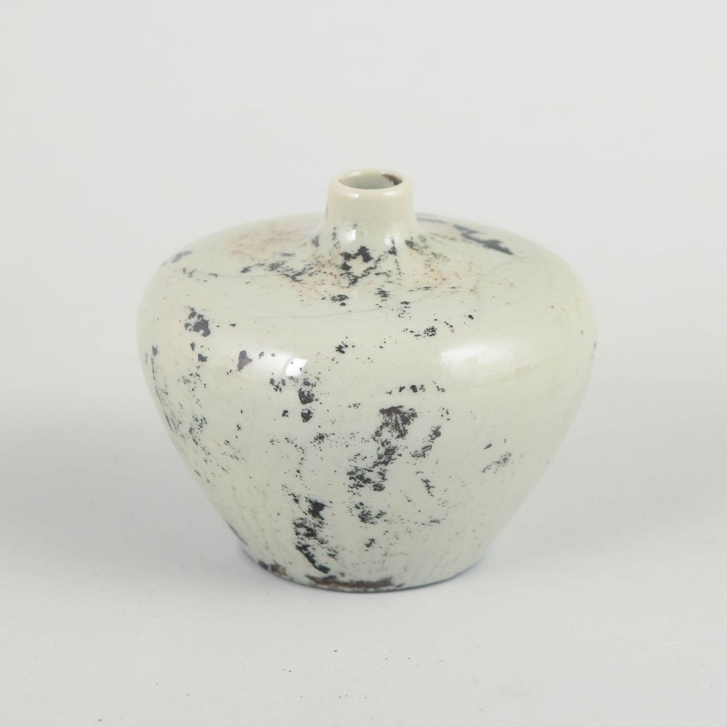 Carl-Harry Stålhane for Rörstrand, miniaturevase.Lille drejet vase i stentøj med lys cremefarvet glasur og spættet dekor i mørke toner, med blød, afrundet form, udført i høj fabrikskvalitet.